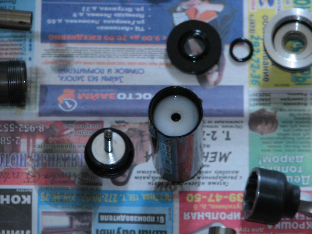 Их замеры показали, что подшипники имеют параметры кареточных (37х7х25), какие стоят во внешних чашках кареток-интеграшек (под пластиковыми хрупкими пыльниками). А уж они-то у меня имеются. Почистил посадочные места под промы во втулке, слегка смазал консистенткой, что б сажать не насухо и запрессовал новые промы в обратном порядке, используя старые в качестве упоров-подкладок при запрессовке свежих.