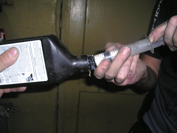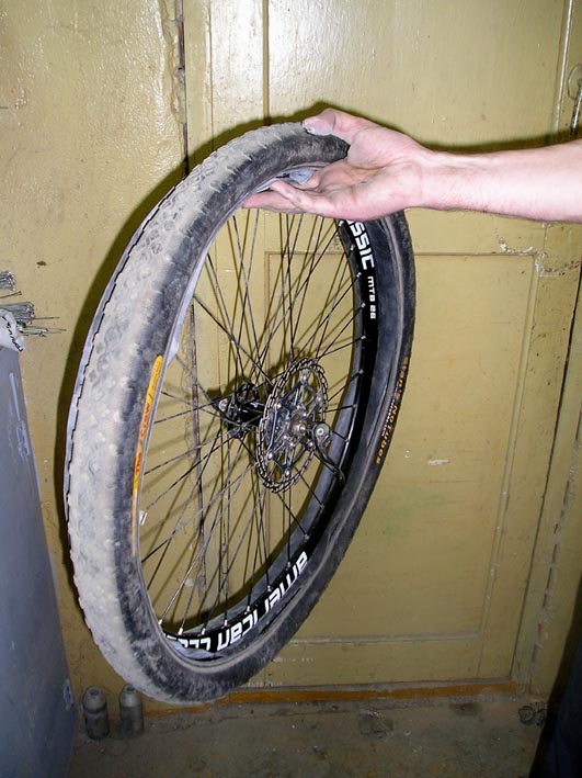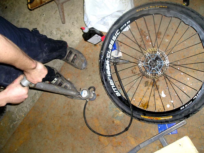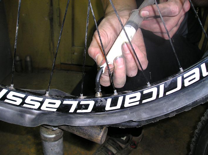 Для этого, с некоторым трудом, были изысканы две камеры на 24” с ниппелем под престу.Камеры были надеты на обод и слегка накачаны. После этого, с помощью ножниц они были разрезаны по центральной линии. Следующий, самый геморный этап – натягивание покрышки поверх обода с надетой и разрезанной камерой. Без помощи Zheny эта процедура не удалась бы. Наконец установив покрышку, приступили к самому интересному – накачиванию. Попытались это сделать насухую, дико работая напольным насосом. Бесполезно. Воздух выходил вдоль неплотно прилегающих бортов покрышки. Тогда через ниппель, с помощью шприца 20-ки с надетым куском велошланга внутрь напустили 50 мл герметика. Опять начали истошно работать насосом. Бока покрышки вздымались как у подыхающего удава и тут же опадали. Из под бортов лезли белые пузыри герметика. Там где они особо интенсивно лезли пришлось мазнуть солидолом. После этого покрышка стала набирать воздух. Шипение продолжалось, хотя не так интенсивно. Теперь его источником были проколы покрышки, полученные за год ее камерной эксплуатации. Проколов было с десяток. При накачивании колеса атмосфер до 5 из самых крупных дырок бил спрей герметика. Наглядно было видно как действует герметик. Повернув колесо, чтобы очередная дырка была направлена вниз, можно было наблюдать сначала тонкую струю герметика, а потом, через пару секунд, зарастание дырки и прекращение шипения. К сожалению, из за того, что покрышки были неновые, утечка воздуха осталась. За ночь колеса спустили. Автор божится, что попробует еще долить герметика и всяко помотать колеса, чтобы утечка убралась. После того, как удалось накачать колеса, осталось бритвой срезать излишки резины, торчащей по бокам колеса и осуществить пробный выезд. Едет лучше, чем до конвертации. Спасибо Zheny и Inokoff-у.