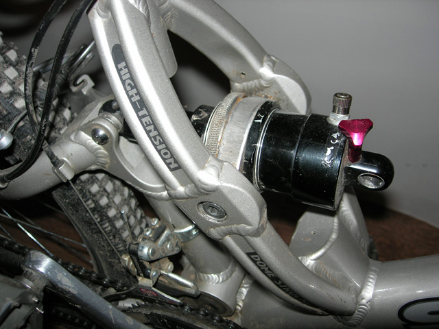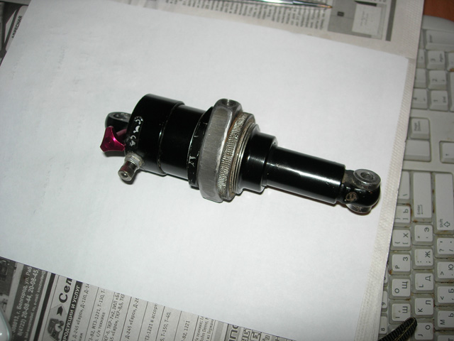 Но довольно скоро у меня вышел из строя задний аммортизатор (как именно и при каких обстоятельствах я не буду тут описывать). Довольно остро встал вопрос о том как же быть, так как крепления у аммортизатора было не стандартное. Покапав в инете было обнаружено что такой же тип рамы имеют велосипеды Carratec. Было написано письмо администрации триал спорта что бы они мне привезли такой аммортизатор (X-Fusion 02 RC). Я был в шоке :shock: . Они запросили за аморт 10000р когда я весь велосипед в то время покупал за 12000р. В общем такие денги я платить был не готов. Походив по магазинам и поняв что подобного девайса мне не достать было решено купить любой воздушномасляный амортизатор, нарезать на его теле резьбу, и вырезать под него крепление. Немного поговорив с псевдомеханиками (они мне говорили что такое просто невозможно, что аморт на такое не рассчитан) я поехал в Москву. Там я выбрал самый дешёвый на тот момент и самый подходящий по размеру RS Bar 2.1 с регулировкой отскока с размерами 165х38мм за 3500р по тем времинам. Был найден токорь который всё сделал буквально за бутылку пива. И вот что вышло: