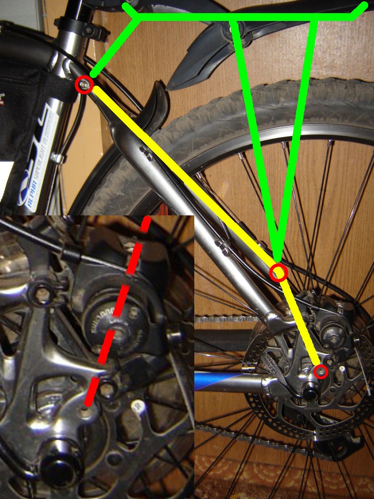 Оно вроде бы все легко, и крепления под традиционный багажник есть... ...но это только с правой стороны вела, а с левой оггромную проблему создает калипер механического тормоза... так что доступа к этой дырке в раме практически нет. Примерял багажник, так он пересекает калипер прям посередине, если подставить его к этой дырке(( Торчит калипер от рамы аж на 3 см наружу: Если на перья хомутами, то краску всю пообдерет, я видел такое. Так что надо использовать вот эти мелкие дырки в раме (хотя, поидее, они все таки для железного крыла, а не для багажника)