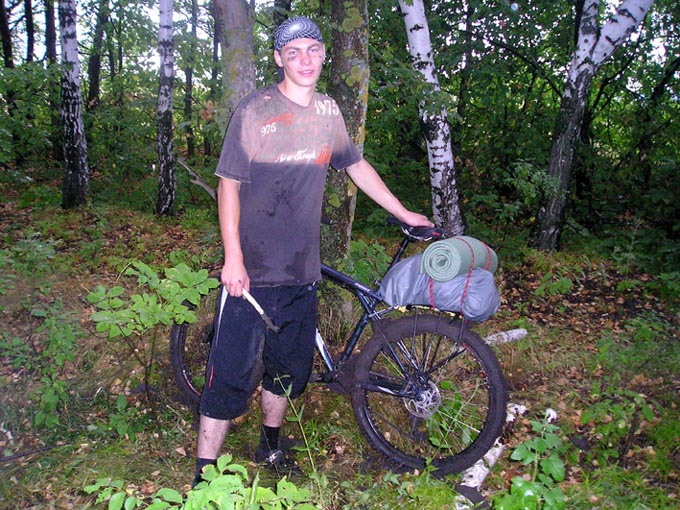 Подвох я начал чуять километра через три, когда начало клинить переднее колесо, вместо заднего. Но мы отчаянно перли как танки, где по траве где по говну и неумолимо приближались к цели. Тогда заработала тяжелая артиллерия. Что-то сверкнуло, грохнуло над головой и полилось. Таких зачетных гроз я могу пересчитать по пальцам. Спрятавшись под тентом в лесополосе, начали мы мутить обед, и выяснилось, что питьевой воды собственно немного, а на приготовление нет вообще, ибо привал не планировался ни под каким соусом. Тогда стали собирать дождевую воду, и о чудо! или о ужас? я мигом без проблем собрал почти три литра, при том что часть проливал, переливая из миски в бутылку. Бог Хавчик взял в тот день выходной… Пришлось с боем прорываться самим. Едва стих дождь мы где пешком где верхом, двинули по лесополосе, через пни ямы и бурелом, понадеявшись что черед каких то 9-10 км будет обещанный штурманом асфальт.