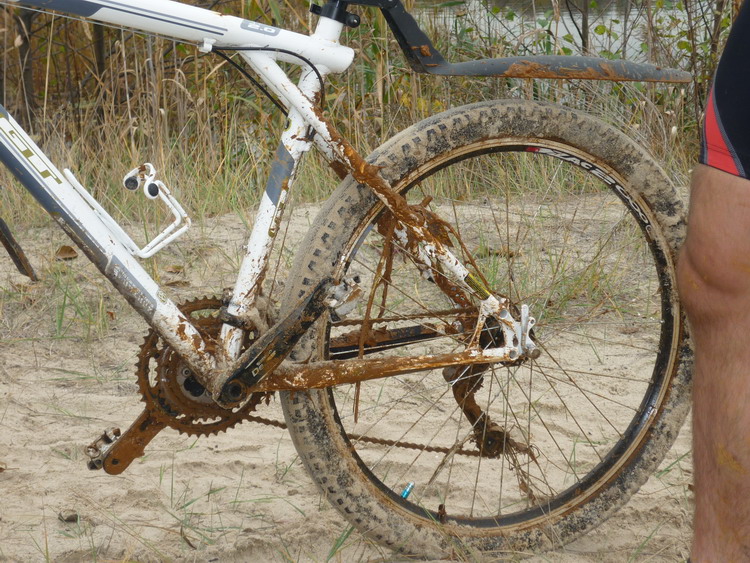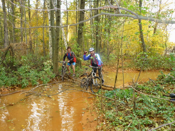Особенно если только один передний тормоз, как у Радлера. Когда требования маршрута оказывались шире диапазона возможностей тормоза , велосипед отделялся от земли и пролетал какое то расстояние по воздуху в режиме хаотической выборки из массива случайных траекторий. На Белой горе коналекс не выдержал и уехал домой, а мы очень скоро оказались у Красной реки, которую преодолевали по двум бревнышкам. Уделались все. На белой раме Радлера речные наносы смотрелись наиболее пикантно. Колючку водозабора какие-то доброхоты усилили проволокой "егоза", поэтому часть привычных ходов оказалась недоступна, а в конце пришлось лезть по трубе на высоте метра три от земли.