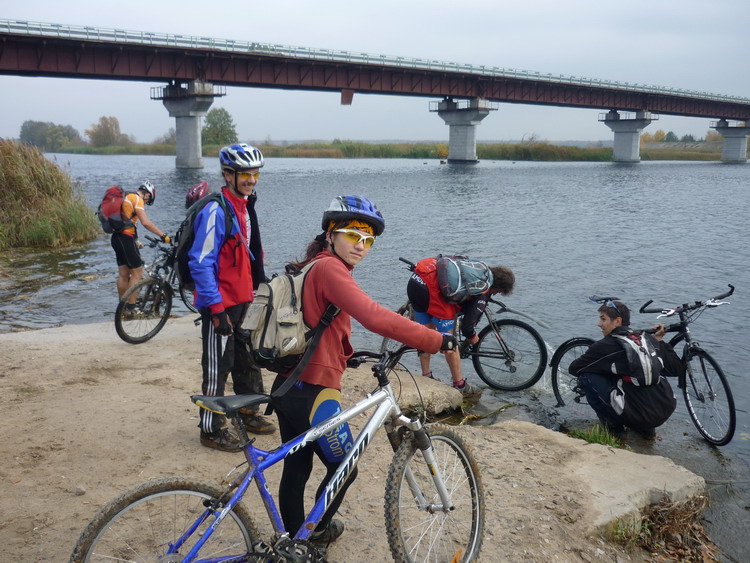 Продравшись сквозь камыши, под окружным мостом принялись наливать во втулки и подшипники речную воду, одновременно пытаясь избавиться от следов Красной реки. Переехав на левый берег, по - честному, песками вдоль воды устремились в Отрожку и далее по маршруту. У северного моста нас покинула юная Галя и Кипер. Впятером, прибрежными кустами мы поехали к Чернавскому мосту, я как то умудрился разминуться с остальными, встретились только у Чернавского. До ВОГРЕСа ехали по бетонной окантовке водохранилища, иногда было узковато. После ВОГРЕСа и впадения реки Дивинилки в водохранилище уткнулись в достопамятную преграду в виде нависшего над водой забора и дерева при нем. Вован как супермен полез верхом, некоторые низом. Потом долго объезжали здоровенный масловский залив с впадающей речкой Тавровкой. У Таврово ехали по кромке воды,