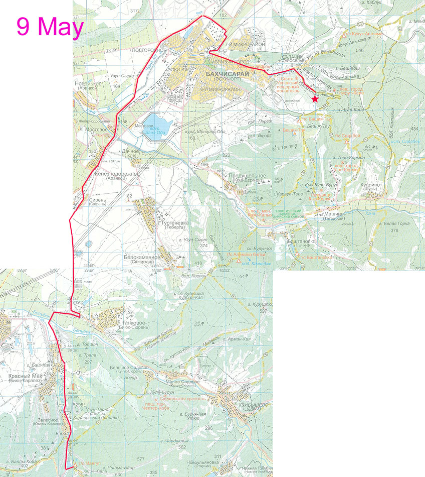 Вкратце маршрут поездки можно описать как Симферополь - Судак - Ялта - Бахчисарай - Симферополь. Поездка была вполне матрассная, за все время проехали по моему компу 350 км. Можно сказать что если вам по силам проехать например в субботу 100 км, а на следующий день вас не напряжет проехать еще 70, то значит такой маршрут по Крыму вполне для вас комфортен. Конечно не стоит забывать что возить груз на багажнике проще чем на спине, и вообще нужно внимательно относиться к тому чтобы не брать лишнего веса, но и взять все что действительно будет восстребованно. На майские праздники в Крыму бывает достаточно холодно (у нас несколько дней ночью температура опускалась до +4 С) и бывают дожди, так что нужна теплая одежда и какие то способы уберечься от дожда -- накидки, тенты из целофана, непромокаемая одежда, вариантов много.