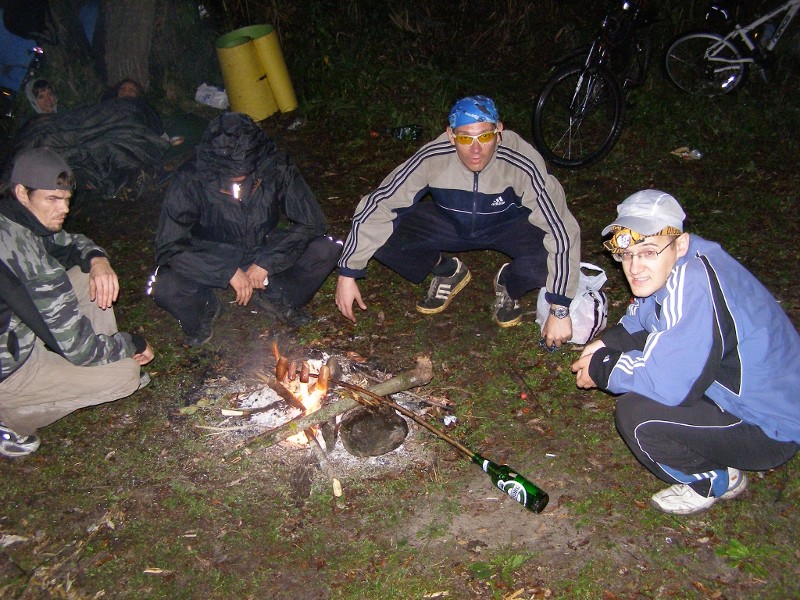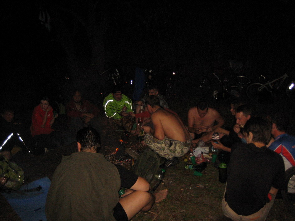 Смеркалось. Я одиноко выдвинул с гормолзавода в сторону плотины к означенному времени. Чуть не доезжая до плотины (я таки опоздал ввиду долгих сборов рюкзака и терзаний между мыслями "это может пригодиться!" и "это лишние граммы на твои ноги!!"), встретил Azurit'a, maximovrom'a и Саню, ник которого я не выяснил (или забыл :oops: ). Вчетвером дёрнули с приличным опережением графика к цирку. Прибыли на точку "Цирк", составив ему в эту ночь существенную конкуренцию своим разноцветным вело-шапито. Порой казалось, что их дрессированные медведи на велосипедах в стенах цирка громко просились к нам, но злые хозяева не пустили бедных животных на волю. Зато хозяева заклятых наших друзей (которые лучшие друзья человека, но главные враги велокентавра), вывели свою армию псов. Но, не смотря на такие дерзские выходки, мы не поддались на провокацию и избежали конфликта, ставившего под угрозу успех всей операции. Запаслись провиантом в несколько ходок на "Перекресток" и пожали к кольцу на точку "о! бл. ГАИ!", где, сделав почётный круг, обнаружили подкрепляющееся топливом подкрепление нашего спец. наза. Ещё запаслись провиантом (видимо шоб уж наверняка) и двинули потихоньку к Усманке в означенное Птенцом место. Ехали сначало растянуто-кучно. Затем совсем растянуто. Потом растяяяяяянуто ваааащееее ехали. В конце концов нервы не выдержали и небольшая группка таки пошла вперед на скорости 30, иногда 40 км/ч. Уже у самой реки собрались в кучу (к тому времени самые нетерпеливые из лидеров уже купнулись в районе тарзанки) и покатили все вместе в "гнездовье" Птенца. Место действительно оказалось замечательным. Разожгли костёр, пожарили сосисок, покупались и т.д. строго по программе проведения досуга, утверждённой санэпидемнадзором, МВД и пожарниками. А потом... пошёл дождь. "Но у нас с собой было..." (с) М.М.Жванецкий, и поэтому мы не растерялись, умело натянув полиэтилен на дерево, давший нам некоторую весьма условную, но всё же защиту от дождя. Видимо под действием алкоголя, разгорячённые сердца его принимавших не выдержали, и они рванули посеред ночи не то в баню, не то в кафе, не то в гараж - это уже они уточнят, т.к. я был трезв как стёклышко и не совсем понимал их. Мы же (трезвенники и язвенники) остались под деревом бороться со сползавшим полиэтиленом и требовать у Богов пощады. К утру небо над головой рассеялось, мы поглазели на звёзды, на рассвет, обсудили на что похожи облачка... Короче еды не было и мы отвлекались от голода как могли, пока не привезли Арбуз. Как только его привезли у нас обнаружилось невероятное количество заныканых по разным карманам, пазухам и пакетам сосисок и сарделек, хлеба, кетчупа и пр. В общем пир горой, резанный Таниным микроскальпелем арбуз - просто чудный, сардельки-сосиски с хрустящей корочкой и непередаваемым ароматом (оценить который смогли только те, кто остался, хотя я допускаю, что аромат мог докатиться и до Воронежа...) от Повара, чаи на любой вкус и цвет в ассортименте: в общем всё, что только душе угодно. maximovrom'у даже так не хотелось уезжать, что мы уж хотели ему сооружать заповедник, почти составили график его понедельной кормёжки и прикинули проект выкопа землянки на зиму. Насилу уговорили его уехать с нами в Воронеж. Ввиду поднявшегося солнца и настроения прикалывались и смеялись так много, что кажется не всем из-за хохота и поесть-то удалось. Неспеш