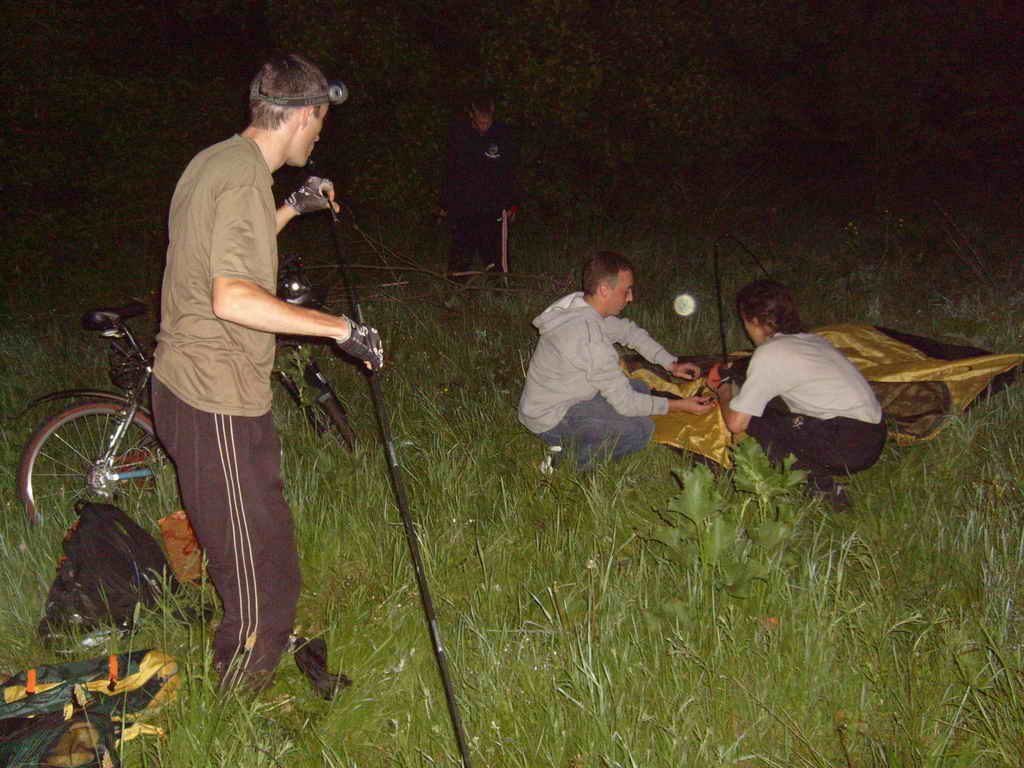 В трешке СергеяП на троих участников регаты был один спальник и две пенки, что, впрочем, не помешало им благополучно дожить до утра. А утром начался обещанный ливень. Слава богу я проснулся достаточно вовремя, чтобы заметить что наша палатка дала течь, и завернув все пожитки в велочехол, я уполз в соседнюю. Там долго не открывали - хитрый вход с кучей замков дал о себе знать :)