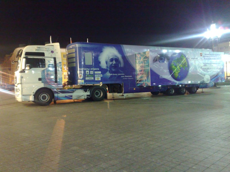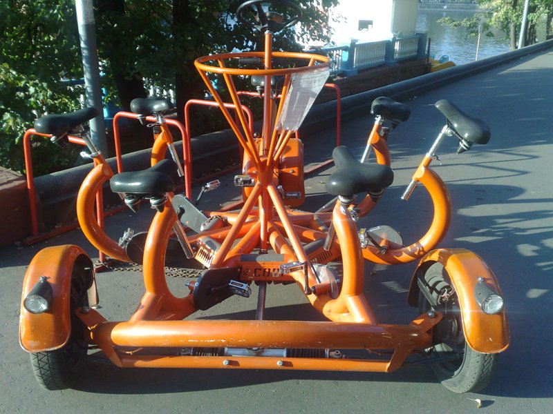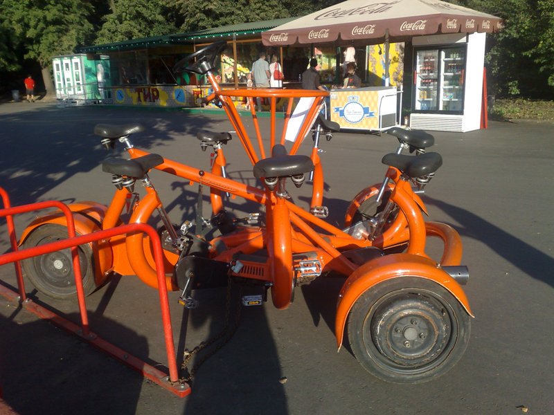 Смотрите какие многоводительские велосипеды я нашел сегодня в Парке Горького! Не тандем даже, а мультитандем! А парковка для велов какая оригинальная? Прототип Range Rover уже стоит на обозрении. У манежа стоит вот такой грузовик, внутри можно посетить выставку нанотехнолгий. Завтра пойду. В таком фургончике целая трешка поместится! Класс придумали.