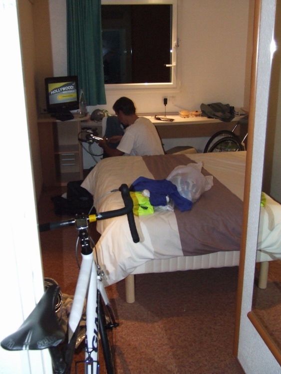 На рецепшене выяснилось, что я при бронировании перепутал месяц и забронировал гостиницу на июль. Тем не менее, нас поселили, выделив двухместный номер с супружеским ложем. Поднявшись на этаж, обнаружили других велосипедистов, в том числе русских. Народный характер экономики Франции проявился в отсутствии круглосуточных магазинов где можно было бы купить еды. Впоследствии оказалось, что по викендам они тоже не склонны работать. А кушать хотелось. Я оставил Радлера сторожить номер, а сам отправился через дорогу в кафе "Гиппопотам", полному людей. Кажется французы едят не дома, а во всяких кафе. К моему ужасу, из приемлемого съестного я обнаружил гамбургеры по 13 Евро (540 руб) штука.Я попросил четыре гамбургера с собой, мне сказали, что с собой нельзя. Пришлось сесть, и заказать бокал пива и четыре гамбургера. Выпив пива, я сказал, что ухожу, а бутерброды беру с собой. Официант недовольно покачал головой, но сказал, что найдет коробку для бутербродов. Настало время расплатиться. Попытки сделать это моей карточкой оказались безуспешными, хотя я только что расплачивался ей за гостиницу. Пришлось бежать к Радлеру за наличными. Разблокировать карту во Франции так и не удалось. Из номера можно было дозвониться куда угодно, кроме России. На мобильнике денег на долгий разговор с банком не хватало. Впоследмтвии выяснилось, что бдительный Альфабанк после платежа на 500 Евро из Франции за гостиницу на всякий случай заблокировал карту. Вернувшись с добычей в гостиницу, съели гамбургеры и начали разбинтовывать и собирать велы,