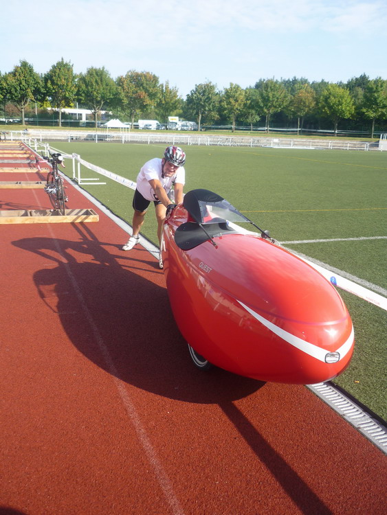 при дворце, где делалась мировая история. К СенКвентину пришлось лезть в подъем. На подходах к стадиону стали встречаться прицепы-дачи с иностранными номерами а вскоре наткнулись и на первых волонтеров, показывающих руками, куда рулить. На въезде на стадион попали в лапы первых двух контролеров. Они проверили тормоза, передний и задний свет и наличие светоотражающей жилетки. Долго обсуждали между собой мои рулевые рога, но потом махнули рукой - мол ОК - все в порядке, и пропустили на стадион. Оставили велы рядом с привлекающим всеобщее внимание веломобилем,