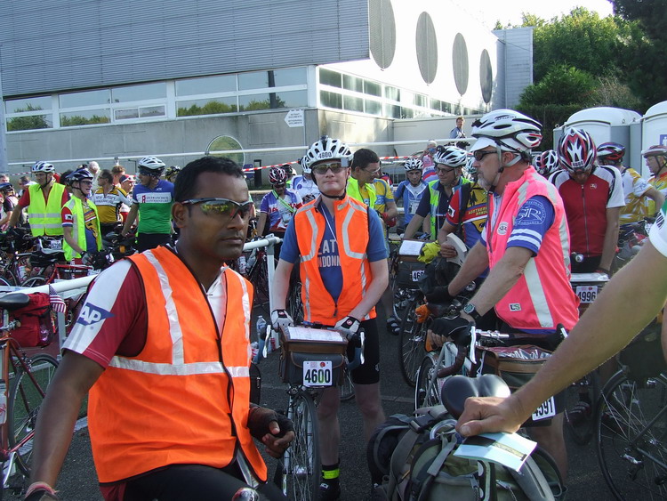 при дворце, где делалась мировая история. К СенКвентину пришлось лезть в подъем. На подходах к стадиону стали встречаться прицепы-дачи с иностранными номерами а вскоре наткнулись и на первых волонтеров, показывающих руками, куда рулить. На въезде на стадион попали в лапы первых двух контролеров. Они проверили тормоза, передний и задний свет и наличие светоотражающей жилетки. Долго обсуждали между собой мои рулевые рога, но потом махнули рукой - мол ОК - все в порядке, и пропустили на стадион. Оставили велы рядом с привлекающим всеобщее внимание веломобилем, а сами отправились для дальнейшей регистрации в зал. Наши опасения по поводу вчерашней неявки развеялись. Никто и слова не сказал. Дали планшет, номера, карточку, чип, медаль суперрандоннера за 2011г. Среди волонтеров была русская девушка из Челябинска - Чехии, дочь одного из участников. Она нам все и объяснила. На стадионе выдали официальные джерси, фляжку. Радлеру выдали жилетку. В палатках торговали майками, изотониками, всякими велоприбамбасами. Два английских веломужика у своего стенда рекламировали пробег Лондон - Эдинбург - Лондон. Не такой раскрученный, как ПБП (в 2009г. 750 участников, в том числе и россияне), но проходящий тоже раз в 4 года со сдвигом относительно ПБП в 2 года. То есть следующий в 2013 году. Дистанция 1400км. Меня заинтересовало. Взял у них брошюрку. В общем, поскольку народу с утра было немного, с регистрацией управились быстро и отправились в гостиницу отдохнуть перед стартом. Обратно в гостиницу ехали покороче - через Версальский парк. Это очень популярное место отдыха. На траве сидят, по дорожкам бегают и ездят на велосипедах (только там видел МТБ, в остальном Париже ездят на дешевых турингах, коммьютерах, шоссерах), по пруду катаются на лодках. Из отдаленного дворца несется симфоническая музыка. На лугу устроена овчарня и живут