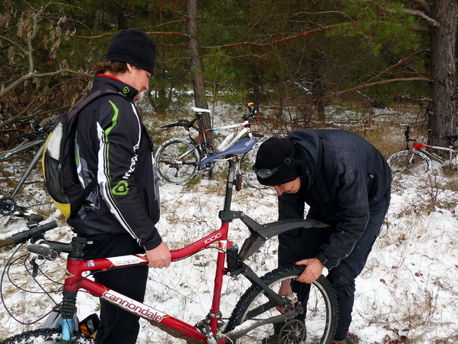 К посещению усопших паровозов готовились кто как мог. Запасались едой, надевали самые гладкие узкие и изящные покрышки. Иван Иванович оседлал свой новый двухповес . Олег Андреевич надел праздничную одежду и разучил хореографическую композицию, которую исполнил на привале. Привал устроили, уже миновав Ступино, на кромке заповедника. Там оказались, свернув с М4 у второго поста ГИБДД, лесом доехав до Старо Жыво Тинного, а потом парком в Айдарово и, объехав Рамонь. Привал из-за хороших дров и больших запасов съестного вышел на славу. Дальнейшая дорога к Пчельникам, вдоль границы заповедника, была как никогда накатистой. Даже шипы, несмотря на понты и дороговизну не мешали. Мне, примерно с половины пути, стала мешать растянутая в хлам цепь. Пришлось ехать с диким каденсом, на маленькой передней звезде, чтобы передача не проскакивала. В Пчельниках пленились избой, проросшей насквозь ветлой. В полной тишине и с некоторым волнением перешли границу Воронежской и Липецкой областей, проходящую по реке Студенка. Настала пора углубляться в заповедник. Сделали это по – диверсантски – след в след, взяв велосипеды на руки. Таким образом у обходчика должно было сложиться впечатление, что в заповедник вошел один пеший посетитель, который был маленько не в себе и сильно вклепывал ноги в земную твердь. Через сто метров конспирацию свернули, оседлали велы и вскоре очутились у полуразложившегося моста через полузамерзшую реку Ивницу. Развилка дороги манила свернуть на Кудеярово городище, но искушению не поддались. Двинули в сторону Графской – Бора. Слева в лесу хрустнула ветка. Причиной хруста оказался здоровенный лось, который шел с нами параллельным курсом метрах в ста слева. Он обогнал нас, вылез вперед на дорогу, а потом ушел вправо. Следы его копыт на дороге впечатлили. Даже мысли о паровозном кладбище перестали мучить. Вскоре выехали на более накатанную дорогу и оказались у кордона на ж.д. переезде в районе Бора. Мимо борской психиатрической лечебницы за новым высоким забором и мимо заброшенной колонии за старым высоким забором поехали на станцию Рамонь где когда-то в тупике действительно стоял один паровоз серии «Э». С тех пор как его распилили, паровозов там не регистрировалось. Привычным путем доехали до Отрожки через Маклок и Дубовку. Чтобы поход отбить решились на посещение мумии паровоза ФД - Феликс Дзержинский, которая стоит у входа в депо. Это именно мумия, с обрезанными органами управления в кабине, в которую нельзя попасть, с разобранным стокером и сгнившими дымогарными трубами в котле. Из за громадных размеров этот паровоз не мог пролезть во многие железнодорожные закутки Страны Негаснущего Солнца. Кроме того он был дико прожорлив, чем снискал себе уважение советских людей, ведь издревле в деревнях судили о работнике по тому насколько много он ест. Несмотря на сдавленные угрозы шляющегося персонала депо, мумию паровоза покорили. Это послужило некоторым утешением от безрезультатной 120 км. прогулки. во время которой ВованББ дал убедительный отпор попыткам мирового трансглобализма пристрастить простофиль к бесполезной и дорогой шелухе мирового велопрома в виде аммортизационных вилок и шипованной резины. Он, как я уже засвечивал, ехал на шоссерных колесах, держа равнение на классиков. Ту -Ту.
