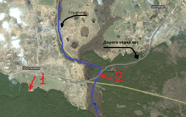 На карте, в силу причин уже мной упомянутых, нарисовать не могу. А дорогу найти очень просто. Из Пчельников надо выехать в сторону деревень Беляево, Студенки. И переехав в лесу ручей Студенку, метров через тридцать свернуть вправо, в заповедник. Это от околицы Пчельников метров триста.