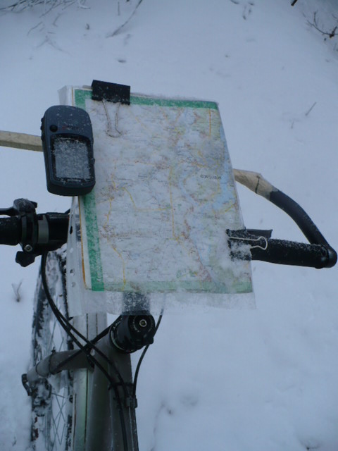 На велосипеде приятно ездить по утрамбованным дорогам. Если дорогу приходится тропить, то это гораздо удобнее делать на лыжах. Поскольку мы просто катались и перед нами не стояло амбициозной цели прорваться на другую сторону озёр к Воронежу любой ценой, было решено объехать полигон с южной стороны по утрамбованной колее, которая как раз шла вдоль его западной границы. Несколько раз за границу полигона уходил одинокий автомобильный след. По относительно узкому рисунку протектора с развитыми грунтозацепами по краям можно было предположить, что этот след оставил армейский УАЗик, который нарезал петли по полигону. Такое отклонение на восток показалось нам малоперспективным и в итоге мы возвратились практически обратно в Камено-Верховку. На треке этот «манёвр» нашей группы по объезду территории полигона с западной и южной стороны похож на перевёрнутую букву S.