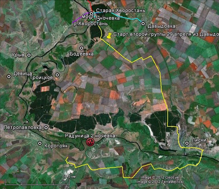 ) (http://pass.rzd.ru/pass/public/pass?STR ... 24.04.2012) до станции Давыдовка. В 9-15 прибывает в Давыдовку и прется до села Старая Хворостань. На мосту через реку Хворостань старший группы отзванивается по телефону 8-905-650-80-39 и ждет проводника, который проведет группу №2 до места ночевки группы №1. Совместно поедаем поздний завтрак и выдвигаемся на маршрут.