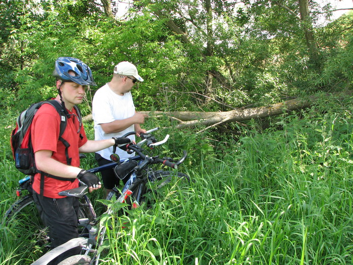 Сказывалась жара. Я же все-таки принял решение менять камеру. Как оказалось, спускали воздух «незажившие толком змеиные укусы». Поменял. Метеор же пока ехали до моста, сообщил, что у него опять падает давление в колесе, и что он не станет дожидаться нас, а махнет в Давыдовку на электричку. Попрощавшись с ним, мы остаемся еще минут на 5-7, он же покатил в Давыдовку.