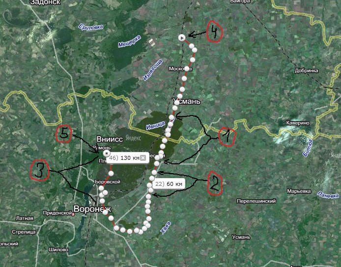 На электричке добираемся до станции Дрязги (4), далее добираемся до места старта с.Московка. Стартуем по грунтовкам и бездорожью к Графскому заповеднику(Он же Воронежский (1) ). Вот с ним надо ещё решить, Байдарочникам приходиться договариваться за ранее о пересечение заповедника по реке, стараюсь найти инфу об этом. В крайнем случае можно объехать... Участок маршрута под номером (2) знаю отлично (Родные места)... По участку номер (3) надеюсь получить информацию на форуме... Конечный пункт у Рамони (5) именно там р.Усмань впадает в р.Воронеж.