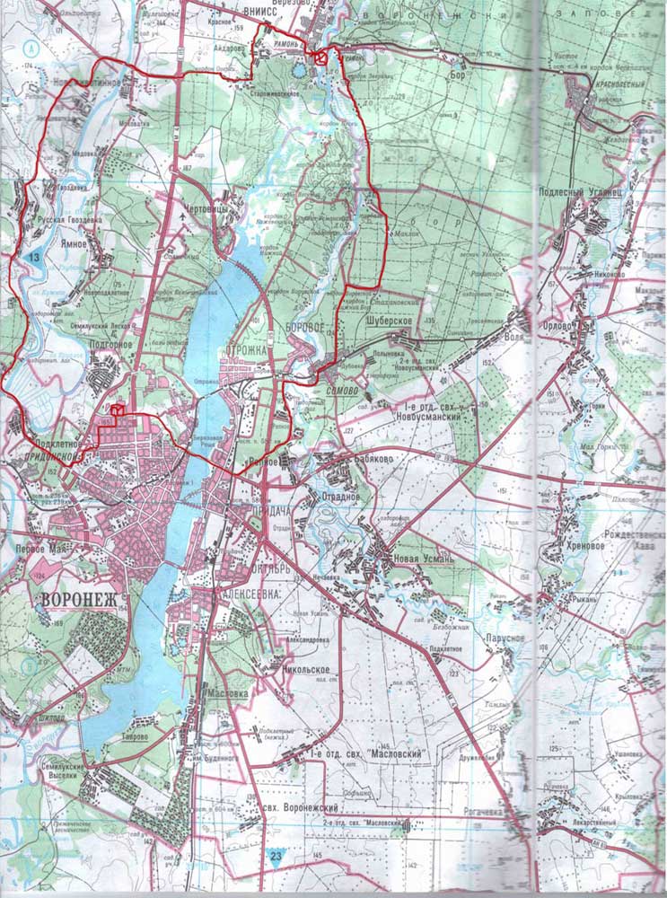 Сегодня катнули с Progom через Семилуки, Новоживотинное, Староживотинное в Рамонь , а дальше через Маклок и Дубовку - домой, по пути в районе Русской Гвоздёвки встретили Радлера с девушкой, они пытались встретится с Неджмдином, вобщем пообщались и покатили дальше, мы в Рамонь , они дальше. Доехали до Рамони без приключений , погодка классная, асфальт, траффик небольшой, вобщем супер. Я искупался в Рамони на пляже где турбазы, вода правда была не очень тёплая, видимо из-за вчерашнего дождя, весь путь старались ехать по асфальту так как беглый взгляд в сторону от дороги , говорил о том , что там нас поджидают говны. После купания и небольшого перекуса покатили домой , как я уже писал, через Маклок. Дорога мне очень понравилась, опять 99% асфальт, правда не очень хорошего качества(клали сразу на бетонку) и всё в лесу , свежий воздух и всё такое.Прикольно было наблюдать , как за нами в воздушном потоке летят разные насекомые, и как верно подметил Андрей , это лишний повод не останавливаться :D . Проехав Маклок попали под небольшой дождик, но решили не останавливаться и на скорости под тридцать лихо долетели до Дубовки, где перекусили и двинулись домой.Хочу сказать что дорога от Турбазы "Лесная Сказка" по лесу конечно живописная, но траффик в это время был неслабый, а так как она узкая ,езда была ещё более экстримальной.Вобщем прокатились на славу. У меня получилось 113 км, средняя 21.Карту маршрута прилагаю.