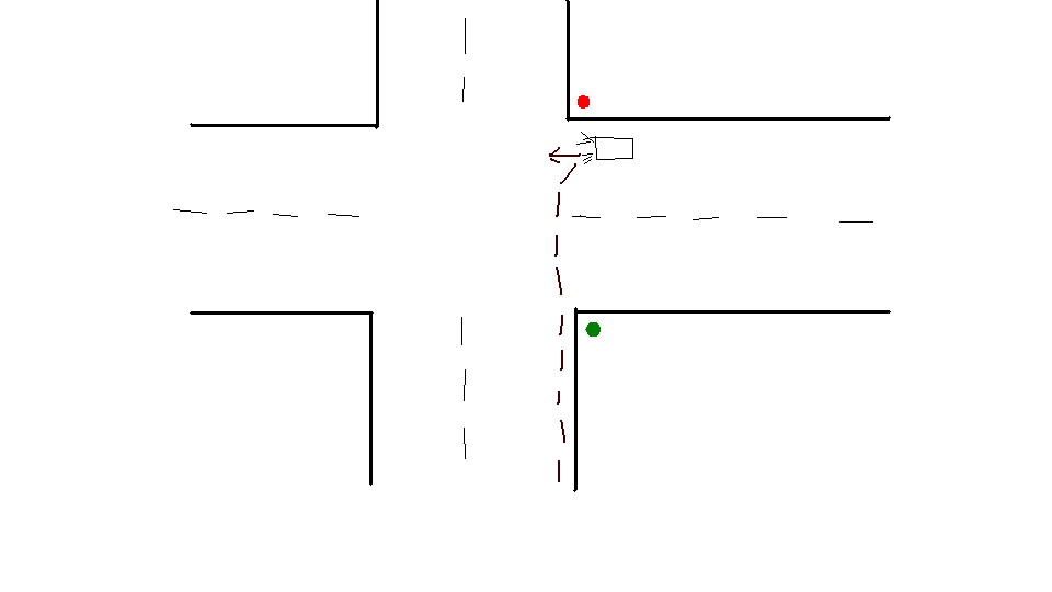 Я никаких проблем при проезде перекрестков не испытываю, ни при проезде прямо, ни при повороте направо, ни при повороте налево. Траектория велосипедиста - зеленая линия, красный и синий - авто.