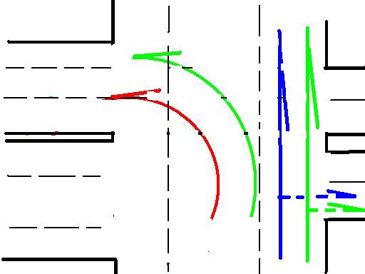 Я никаких проблем при проезде перекрестков не испытываю, ни при проезде прямо, ни при повороте направо, ни при повороте налево. Траектория велосипедиста - зеленая линия, красный и синий - авто.