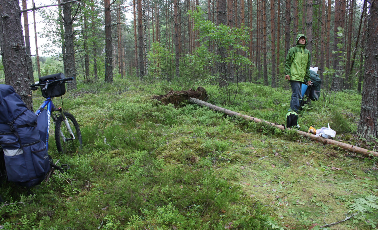 Доехали от Московского вокзала до Финляндского (почему не Финского? не пойму), сели на электричку до Выборга: 200 руб. с человека, 35 с велосипеда (у них как то с великов берут скромно), 2 часа пути – за несколько остановок до Выборга вышли у какого то поселка и поехали искать место ночевки. Мелкий дождь продолжался. Нашли полянку за кустами у дороги – комары сразу показали свой нрав – "ты чей пацанчик будешь" и сразу кровь отхлебывать. Жечь горелку в палатке мы еще не решились – это было фактически первое ее использование.