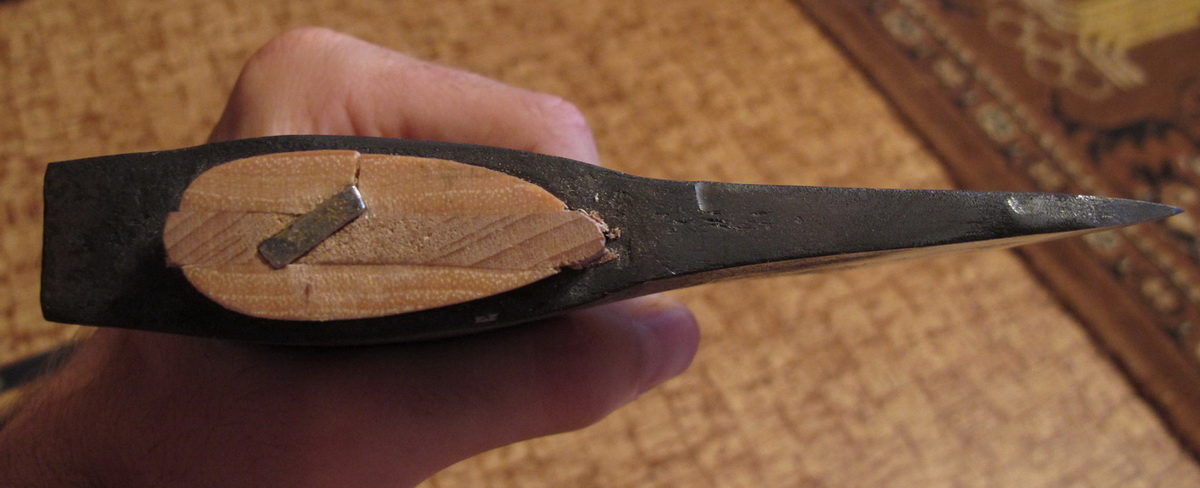 Вот фото монтажа и угла клина. Любителей открывать топором консервные банки ждет разочарование: шведы предусмотрительно сточили острые углы по краям лезвия. В маленькой книжечке среди прочей фигни написано, что топор следует беречь от морозов, а то сталь станет хрупкой, угощать маслом время от времени и не делать заточки с вогнутыми спусками.