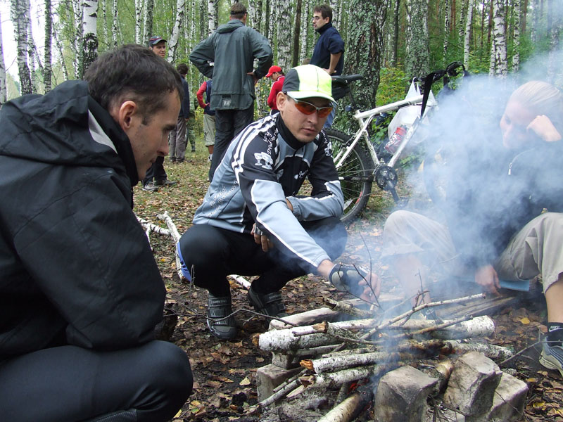 еще минут пять движения и вот виднеется дымок от костра, знакомые лица папараций виднеющиеся через объектив первые встретили нас. Приятно удивило количество участников велофорумки, которые несмотря на погоду в прошедшие дни и вероятный дождь пришли увидеться и показаться