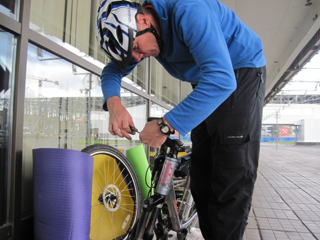Так я паковал велосипед в самолет. Руль снят и плотно привязан к раме. Сережа снимал вилку. Она у него на промподшипниках и демонтировал он её довольно быстро.