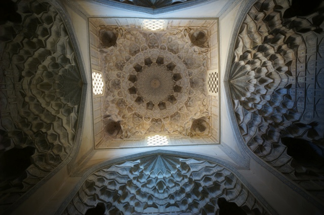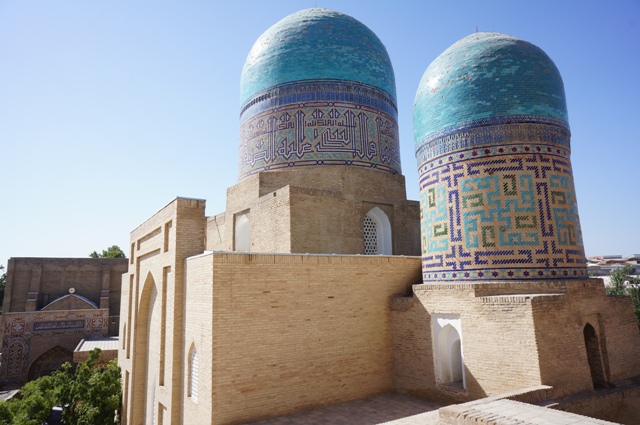 Там же, в Самарканде, в Регистан ведет современная пешеходная улица. В ряду красивых магазинов есть неприметные ворота, в которые постоянно входят и выходят взрослые и дети, через них, вы, как на машине времени, попадаете в лабиринты старого города. Спросив разрешения и разувшись, входим в убранную коврами действующую мечеть, из украшений только несколько часов, отсчитывающих время намаза.