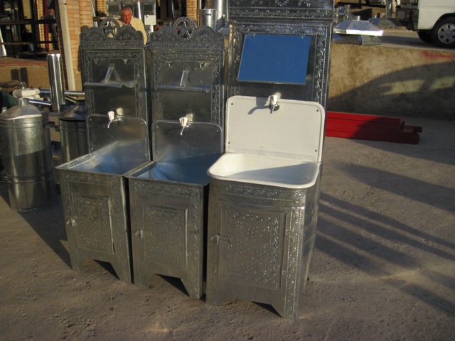 На столе обязательно будет стоять 70% уксус с какими то корешками. Вам уже несут четыре лепешки, зеленый и черный чай в чайниках, с привязанными к ручкам крышками (что-бы они не упали, когда вы наливаете чай): бусы, металлические цепочки, просто шнурки, все идет в дело. Руки еще забыли помыть, и на умывальник глянуть: цветочки, вензеля из оцинковки, произведения современных жестянщиков.
