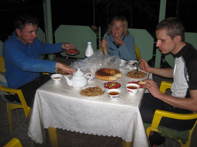 А что кушать то будете? Самса, шаурпа, лагман, шашлык, плов, манты. Везде много мяса, все очень вкусно, и быстро. О калориях можете не беспокоиться, на Веломании кто-то серьезно писал, что езда на велосипеде не способствует похудению, надо пригласить его в следующий поход. Интересно, на рынках довольно разнообразен выбор восточных сладостей, в ошхане вы ничего сладкого не найдете. Нам, в виде исключения, давали сахар к чаю, и у нас собой обычно были какие-то печенья или конфеты. Часто ошхана работает круглосуточно, и если вам нужно на перевал, можно в предрассветных сумерках разбудить хозяина (думаю это не моветон), для вас затопят печь, сделают яичницу с сосисками, согреют чай, принесут варенья в маленьких пиалах.