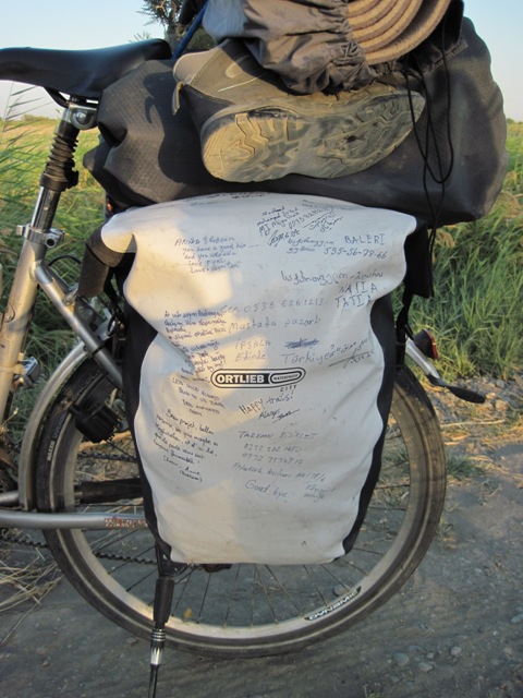 Но за год путешествия (стартовали в Германии), думаю у них были разные ветра, да еще и будут, так как через Киргизию они направлялись в Китай, Вьетнам, затем Австралия, Южная Америка. Скромные, приветливые, улыбчивые ребята. Расписались у них на велорюкзаке.