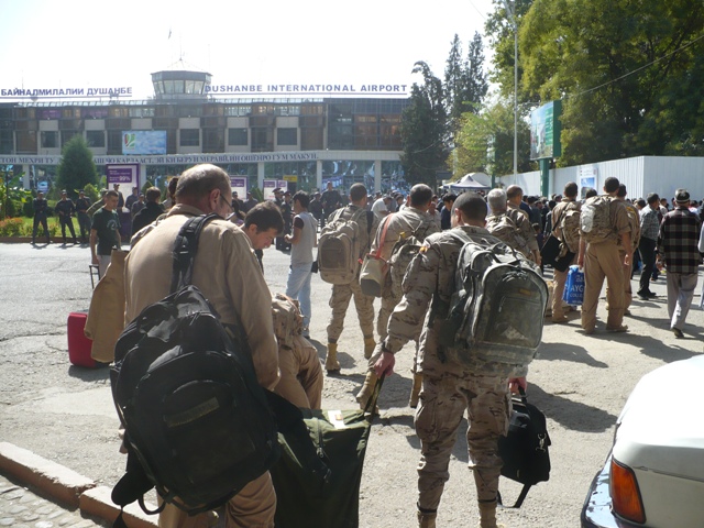 Затем была операция под кодовым названием: "Пройди регистрацию на узбекский рейс" Два окошка регистрации, и толпа такая, что народу хватит на восемь самолетов. Наши велосипеды смотрятся сиротливо в сравнении с коробками с телевизорами, и сумками в человеческий рост. Очереди никакой. Шлемы на голову, в меру наивное выражение, велосипед в качестве тарана и вперед, главное добраться до стойки: "Девушка, помогите соотечественникам, кто же, как не вы?" От девушки вздох: "И для этого я университет заканчивала?" Но главное паспорта взяла. Велосипеды и рюкзаки на весы, все отлично 20 кг. "У вас больше ничего нет?" " Да, это все». Потом с тем же выражением лица (главное шлем не снимать, помогает) тащим в салон самолета еще килограмм по 12. Забегая вперед, хочу сказать нигде ни за какие перевесы не платили, хотя попытка развести на деньги, на обратном пути в Душанбе была, но я показал распечатку по правилам перевозки велосипедов и груза авиакомпанией "Россия", и от нас отстали. Как поднял в воздух такое количество груза немаленький "Боинг", не знаю, но с задержкой на час мы вылетели. Для, страдающих аэрофобией, простой совет: летайте в Узбекистан, скучать и бояться будет просто некогда. У меня было ощущение, что на 300 пассажиров в самолете работал один туалет, рядом с которым мы и сидели, очередь стояла все время полета. Прилетели, южная ночь, пассажиров в аэропорт, самолет, стоящий рядом, под разгрузку. С интересом наблюдаем как из люка, с высоты 4-5 метров плашмя на асфальт падает телевизор. Все формальности заняли часа три (сопоставимо со временем перелета). Мы никуда не торопимся, сидим на рюкзаках в сторонке и наблюдаем, как торгуются таможенники и прилетевшие из России узбеки. Один швейцарец не встал, а буквально сел в очередь, постепенно вытирая попой кафельный пол. К нам даже подошли и спросили: "Это ваш? Может он на кого-то обиделся?" Мы их успокоили: "Наверное, ему так просто удобнее».
