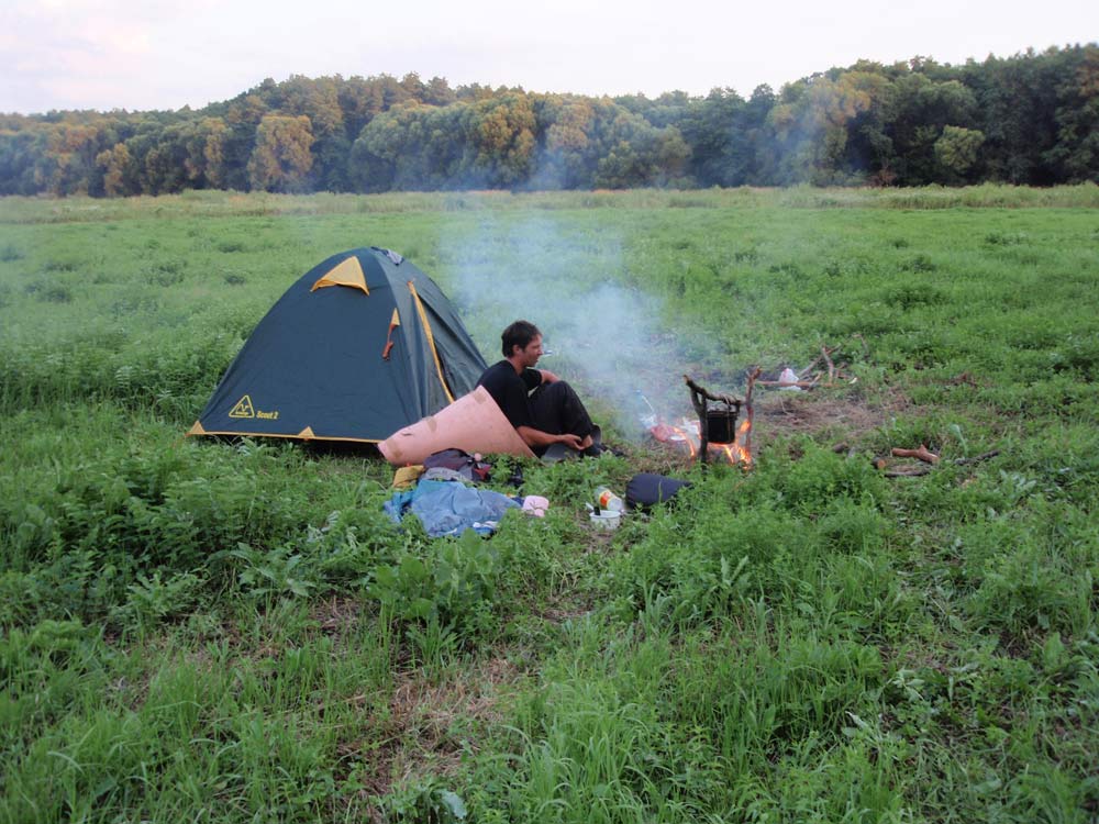 В Солонцах сворачиваем и начинаем искать место для стоянки. Т.е. место в котором я матрасничал там в 98 году. Честно говоря, мы там начали плутать. После чего решили просто выти на реку и двинули через поле. И, о чудо, уткнулись носом в речку. Место нам сразу понравилось и мы решили, что стоять будем здесь. Спрятали велики и пошли искать большую поляну, отмеченную на карте, т.к. я знал где там искать родник.