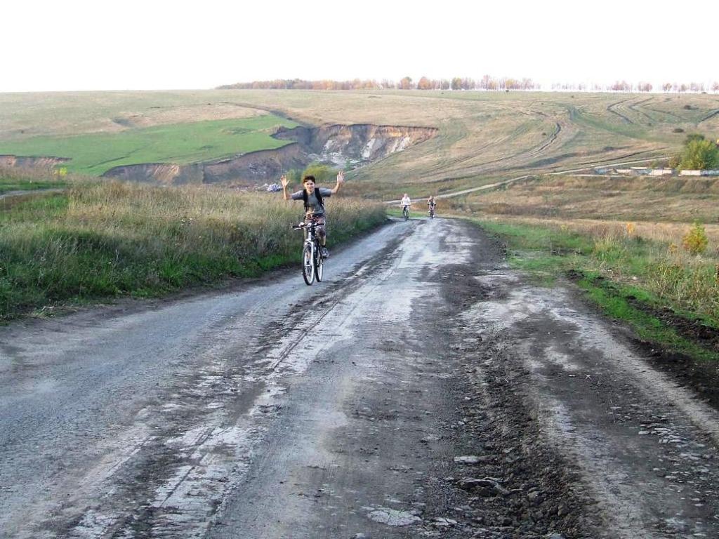 Днем, как я уже упомянул, был занят. Посадили меня за руль авто и заставили ехать на дачу, там дали тяпку и заставили косить бурьян. К полудню намахался я этой тяпкой до мятликов в глазах. Обратно ехал через Рамонь, около ВНИИСС обогнал двух велосипедистов на турингах, яростно вкручивающих, не наших, не с форума. Хотел их с нудного шоссе перенаправить на дорогу лесом через Староживотинное, да постеснялся. Остались они обделенными красотами осеннего Черноземья. У Олимпика догоняю еще двоих, крутят так, что машины чуть не перегоняют. Пригляделся - да это Ivana и Radler возвращаются с покатухи. Махнул я им, остановились и выясняется , что спешат они к танку к началу вечерней покатухи. Ну и ну. Пока я выгружал дары сада, ставил машину в гараж, у танка собрался народ: Tigra, Alexander M, Ivana, Radler, Sergey P. Поход, как и положено, начался с проколотой покрышки. На этот раз у Сергея. Покрышку заменили и поехали первый даунхилл к мосту через Дон, а потом сразу первый апхилл к повороту на Старое. Забегая вперед, скажу что большая часть похода состояла из апхиллов и даунхиллов (ничего, что по - английски?) Один подъем попытались обойти, залезли в бурелом на задворках городской свалки, и , наверно больше времени и сил потеряли в нем, чем на подъеме. Зато потом, затяжной спуск по асфальту к селу Девица, украшенный безжизненными вагонетками подвесной дороги . Когда выехали к курской трассе в Девице, решили маршрут подсократить, реку Девица не переезжать, а двигаться по ее правому берегу. Начались апхиллы и даунхиллы, заехали в карьер с шагающими экскаваторами и БЕЛАЗами, пришлось чуть вернуться и двигать ближе к реке. Долина Девицы испельщрена оврагами, штурмом их склонов мы и занимались. Это создало ложное ощущение, что проехали мы много, поэтому я был неприятно удивлен, когда мы выехали на острогожскую трассу всего лишь в Орловке. Ну и ладно. Двинули в Устье по петинской дороге, залезли в коровник перед Устьем, месили там грязь, но проехали. От Устья спуск к Новогремячинскому, думаю, многие помнят. Он все такой же духоспирающий. От шиловского понтона, чтобы не лезьть в гору по асфальту, двинули вдоль малышевских озер, потом до Тепличного. И уже, вобщем - то в темноте, через Песчаный Лог на ул. Матросова. Для меня жирной точкой в походе была гонка по ул. Кирова и пр. Революции вместе с Radlerом и Ivana. Я намерял 78 км. Tigra, наверное за сто проехала, а сколько за сегодня проехали два героя Ivana и Radler трудно даже представить. Кайф пойман, хоть маршрут и сократили. Всем спасибо.