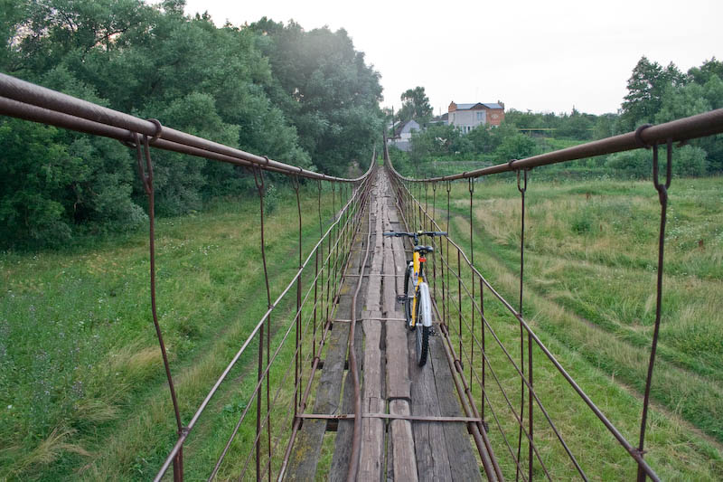 Мы ехали не асфальтом, а от заправки на горе после моста повернули направо к Старому, потом взяли левее, проехали через дачи и вылезли буреломом к концу подъема у Нижнего Рудника на асфаль Семилуки - Девица. Идея была спуститься по этому асфальту в Девицу, что мы и сделали. Таких подвесных мостов через Девицу я знаю по кр. мере два. Один вблизи Старого у озера, другой в Девице. Дорогу через Подпольное и дачи прекрасно знаю, т.к. иногда езжу на полигон в Орловку по работе. Овраг там перед Орловкой зачетный. Последний раз мы его покоряли под дождем, возвращаясь из Костенок. Идея похода состояла в том, чтобы проехать вдоль Девицы. Как я уже писал, нужно больше светового времени.