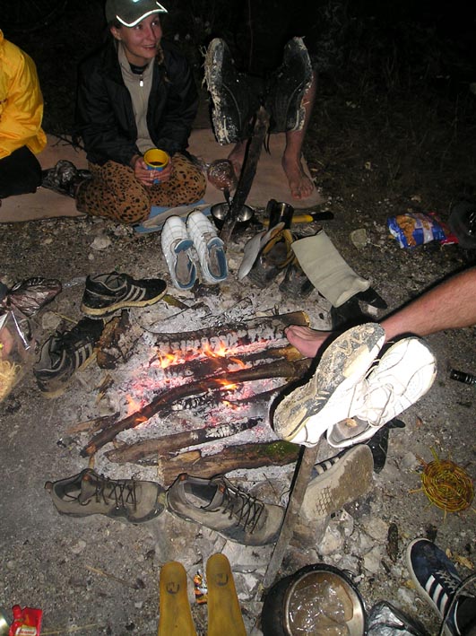 Утро началось с ветра. Собственно я подорвался из палатки от ощущения что меня счас сдует или палатку разорвет. Чую, чую я кочую... ага... Однако лагерь стоял на месте, хотя в левом крыле ночью ставили таки штормовые оттяжки. Тучная авиация по прежнему кружила поблизости. Пора было съедать все что удасться и валить. И пошли мы оживлять велы. Методика такая: кладешь вел в воду и идешь пить чай, возвращаешься и начинаешь отдирать наслоения. Если б из той глины делать горшки - хватило бы чтоб осчастливить весь форум сервизами. Ну и разумеется азарт какой!
