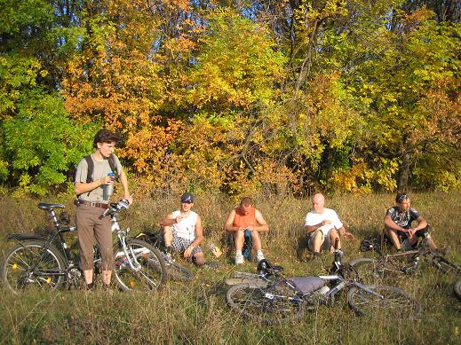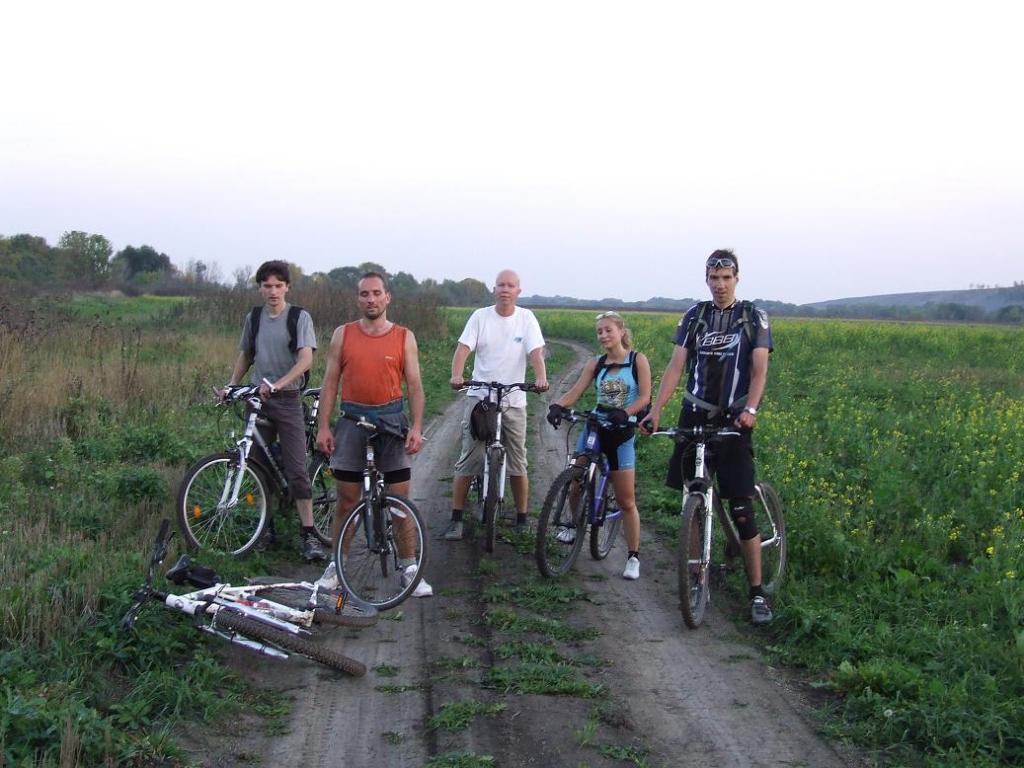 Днем, как я уже упомянул, был занят. Посадили меня за руль авто и заставили ехать на дачу, там дали тяпку и заставили косить бурьян. К полудню намахался я этой тяпкой до мятликов в глазах. Обратно ехал через Рамонь, около ВНИИСС обогнал двух велосипедистов на турингах, яростно вкручивающих, не наших, не с форума. Хотел их с нудного шоссе перенаправить на дорогу лесом через Староживотинное, да постеснялся. Остались они обделенными красотами осеннего Черноземья. У Олимпика догоняю еще двоих, крутят так, что машины чуть не перегоняют. Пригляделся - да это Ivana и Radler возвращаются с покатухи. Махнул я им, остановились и выясняется , что спешат они к танку к началу вечерней покатухи. Ну и ну. Пока я выгружал дары сада, ставил машину в гараж, у танка собрался народ: Tigra, Alexander M, Ivana, Radler, Sergey P. Поход, как и положено, начался с проколотой покрышки. На этот раз у Сергея. Покрышку заменили и поехали первый даунхилл к мосту через Дон, а потом сразу первый апхилл к повороту на Старое. Забегая вперед, скажу что большая часть похода состояла из апхиллов и даунхиллов (ничего, что по - английски?) Один подъем попытались обойти, залезли в бурелом на задворках городской свалки, и , наверно больше времени и сил потеряли в нем, чем на подъеме. Зато потом, затяжной спуск по асфальту к селу Девица, украшенный безжизненными вагонетками подвесной дороги . Когда выехали к курской трассе в Девице, решили маршрут подсократить, реку Девица не переезжать, а двигаться по ее правому берегу. Начались апхиллы и даунхиллы, заехали в карьер с шагающими экскаваторами и БЕЛАЗами, пришлось чуть вернуться и двигать ближе к реке. Долина Девицы испельщрена оврагами, штурмом их склонов мы и занимались. Это создало ложное ощущение, что проехали мы много, поэтому я был неприятно удивлен, когда мы выехали на острогожскую трассу всего лишь в Орловке. Ну и ладно. Двинули в Устье по петинской дороге, залезли в коровник перед Устьем, месили там грязь, но проехали. От Устья спуск к Новогремячинскому, думаю, многие помнят. Он все такой же духоспирающий. От шиловского понтона, чтобы не лезьть в гору по асфальту, двинули вдоль малышевских озер, потом до Тепличного. И уже, вобщем - то в темноте, через Песчаный Лог на ул. Матросова. Для меня жирной точкой в походе была гонка по ул. Кирова и пр. Революции вместе с Radlerом и Ivana. Я намерял 78 км. Tigra, наверное за сто проехала, а сколько за сегодня проехали два героя Ivana и Radler трудно даже представить. Кайф пойман, хоть маршрут и сократили. Всем спасибо.