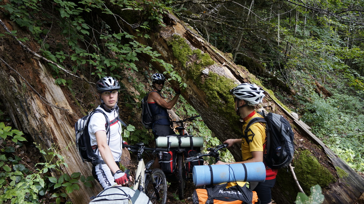 Утром, поняв сложность ситуации с провизией и недееспособностью 1/3 части группы (все эта болезнь), было принято решение отправить передовой отряд(я,Millenium Falcon и nikola26) в Псху . Потратив на это действо около 11 часов времени группа затемно вернулась. Выяснилось, что приходил хозяин пасеки, оставил чуть продуктов, показал что такое самострел (как выяснилось это какая-то хитрая система из лески и бойка с трубкой, под патрон разумеется) и обещал нас на следующий день догнать и показать короткую дорогу. Вечером посовещавшись решили, что за день нам не дойти, а по дороге палатку поставить негде: надо либо идти и ночью тоже, либо бросать велосипеды, идти пешком до Псху, там сохнуть и возвращаться за велосипедами. Однако к общему мнению не удалось прийти, сошлись только на мнении что надо в 7, край в 8 утра уже выйти. Как ни странно дошли мы к вечеру, даже засветло. Правда в процессе похода я обнаружил, что собственно поход похоже для меня прекратился, ибо рама лопнула, но это все надо было решать потом. Придя к бабе Клаве, которая, впрочем, не спешила нас селить и вообще всячески тянула наше вселение к ней. Вечером мы стали думать что же делать дальше. Ситуация была не утешительна: на перевале снег, у меня лопнула рама, местные нам на велах туда не советуют соваться, ибо много бродов, без веревки смоет. Докинуть до перевала на грузовике Studebaker нас соглашались не меньше чем за 10000 рублей, кои мы платить были не готовы, уж лучше самолет вызвать за 18500.