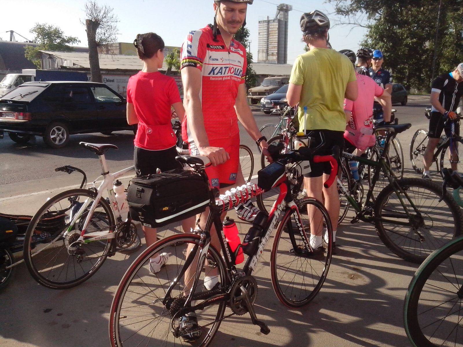 Незабываемый бревет! Полезный опыт...Зря повесил на руль подрамную сумку. Нужно было все распихать за спину в джерси. Из-за этого аэродинамика совсем упала и на спусках ехалось максимум 45 км/ч, а то и меньше (как с парашютом). Стиральная доска по Нововоронежской трассе сделала руки немного онемевшими. Вывод: нужна новая обмотка вместо старой - жесткой. Незабываемые виды природы в районе Нововоронежа, спуски и подъемы. Опробована система 50/34 вместо 53/39, которая оправдала себя в лучшую сторону на затяжных подъемах. Со старта практически до Острогожска ехал последним и добрался к 13.00 часам. Но изначально была задача выжить и сильно не устать. Опробован новый Гармин Етрекс 20. Общий набор высоты по треку составил 1820м. Может брехня?!.. Но зато была полная уверенность ехать правильно по маршруту и не сбиться с него. Из Острогожска до финиша сделали 3-4 остановки для отдыха (температура по спидометру 39 гр.) вместе с Стилл Киллом (Артёмом), который ехал все время впереди в поле зрения. В т.ч. крюк на родник недалеко от развилки на Нововоронеж (в обр. напр.). 2 раза обгонял Wadim4eg(один раз с родника, а второй раз уже на финише в районе 20.00 часов). Потом у Артёма вздулась задняя покрышка (налипшая смола и острые камешки сделали свое черное дело), видимо повредилось в двух местах с боков покрышки. Пришлось ослабить давление в ней и надеяться дотянуть до финиша на скорости не более 20 км/ч, даже на спусках. Нас обогнал Борменталь, удивившись что он не последний, т.к. стартовал в 11.00. Но запасной покрышки у него не было(он брал только камеру). Но все равно спасибо, т.к. вник в возникшую проблему. Огромное спасибо всем помогавшим по ходу бревета: vinylfanatу, другим ребятам(к сожалению не запомнил), организатору Евгению...