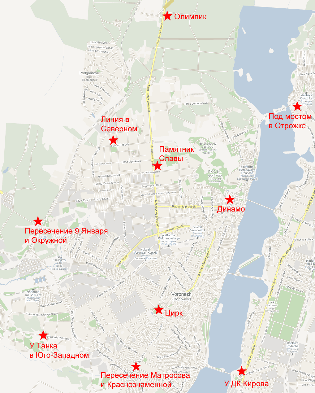 У Танка в Юго-Западном. Чтобы попасть сюда от цирка, надо ехать по Ворошилова, затем на пересечении с Матросова повернуть направо, проехать мимо Юго-Западного рынка, БСМП, и через некоторое время будет танк. Из Северного можно доехать по окружной. От Заставы надо поехать мимо Курского рынка, под виадук, по Пеше-Стрелецкой улице, по Южно-Моравской улице мимо парка, когда парк закончится свернуть налево на ул. Комарова, через некоторое время будет конечная автобусов и дальше танк. См. карту: Пересечение Матросова и Краснознаменной. Чтобы попасть сюда из Юго-Западного нужно поехать мимо Юго-Западного рынка, а затем по Матросова до кольца. Чтобы попасть из центра нужно доехать до Цирка, слева от Цирка, мимо Дома Быта уходит улица Краснознаменная, по ней ехать до кольца. Встречаются обычно на кольце.