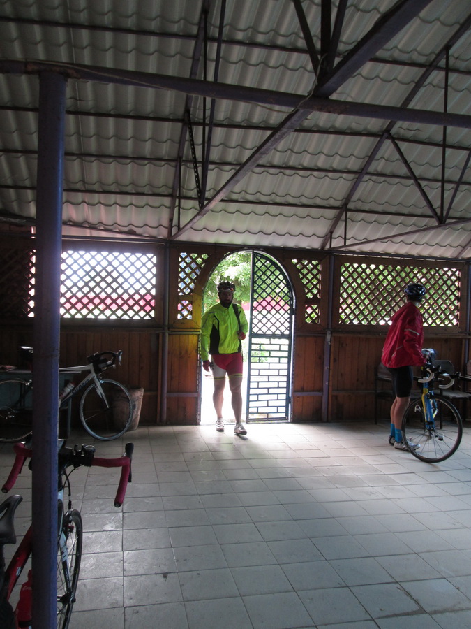 и появился рельеф. На подъемах опять заболела спина, опять остались с Женей вдвоем. Догнали перетон на остановке посреди ландшафтов. К Хомутовке дорога загибалась на северо – запад и ветер становился попутно – боковым. Ехать стало легче, но тут Женя прокололся. Пока чинились, влил настоящий дождь,
