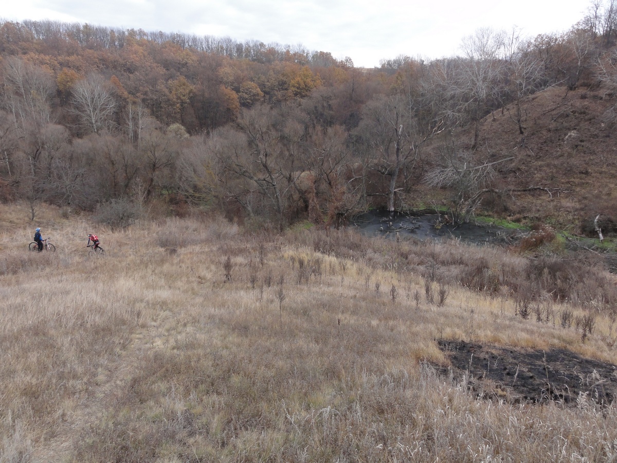 Спустившись с горы мы уткнулись в небольшой запруженный участок с плотиной. Местные аборигены, которых мы расспрашивали, прежде чем спуститься в овраг, упоминали про бобров, видимо строивших эту плотину. Присутствия этих ценных зверьков лично я не обнаружил.