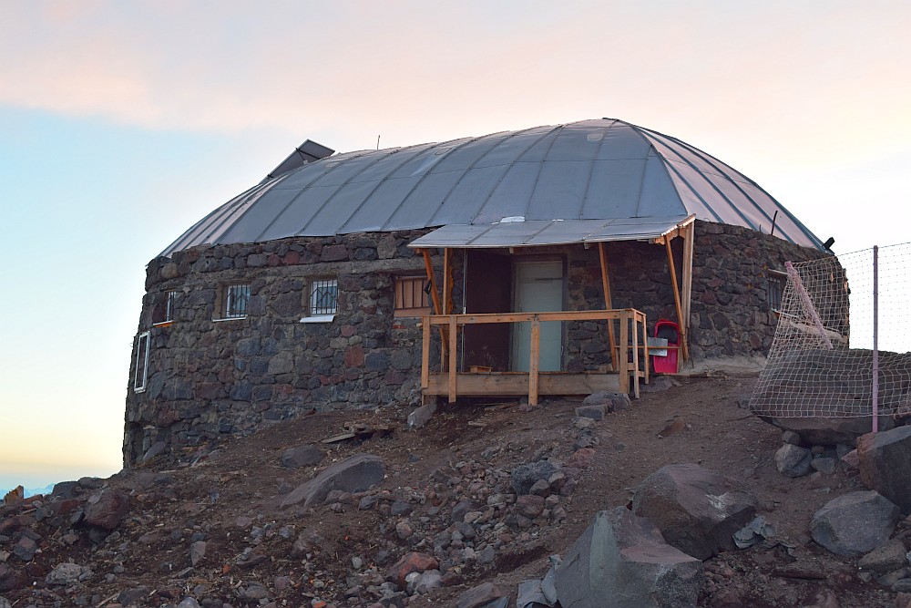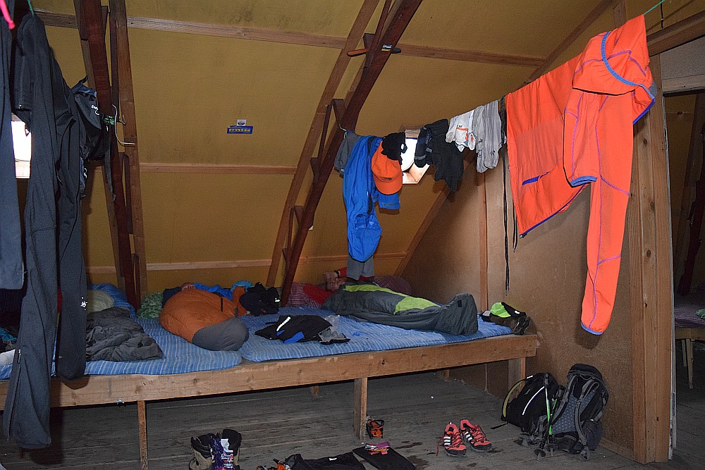 Изнутри картинку не сделал. Напоминает больше всего наверное камеру - по стенкам два ряда нар с суммарно 10 спальными местами и между ними проход сантиметров 80. Разве что без решетки на окне и параши нет. Это еще гламурный вагончик, с электричеством от дизеля. В некоторых, которые выше, даже света нет. Стоит эта радость 600р за ночь. Ночь там начинается с заходом солнца, а не как принято у тех, кто читает это после полуночи. А проблем основных две: холод и габариты. Холод - потому что спальник у меня был очень даже летний, а там не топят (сюрприз! на самом деле нет конечно, но всё равно трохи неожиданно) и под утро вода, натаявшая за день, превращается на полу в лед. Одев всё кроме куртки, в спальнике и под одеялом, под утро конкретно озяб. Габариты - потому что с моим ростом качественно спать на кровати длиной не более 185 см не удается. Но это все ладно, главное - горы, альпинизм типа, романтика!