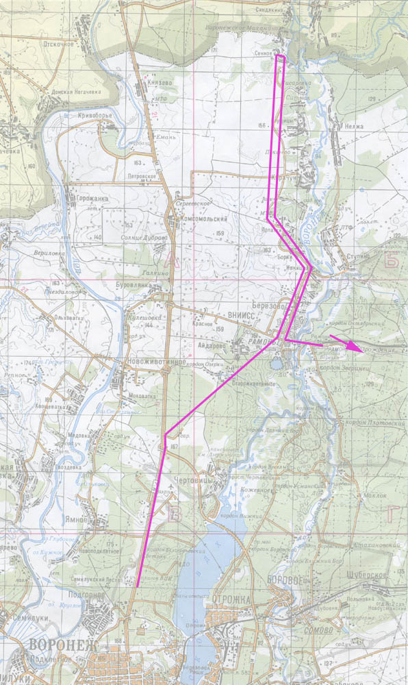 Один мост выше по реке в Савицком, только он не поможет, потому что ниже по левому берегу Воронежа, напротив Сенного впадает моя любимая байдарочная река Излегоща. Ее не только перейти нельзя, к ней с берега просто не подойти. Мост в Ступино тоже не годится, ниже него по левому берегу Ивница впадает и болота всякие. Как вариант туда можно ехать вдоль Дона до Кривоборья, потом, пересекая перпендикулярно М4, полями выехать к Писаревке. Это Сенного не доезжая пару км. Полями дороги хорошие, если нет дождей. А до Рамони асфальт.