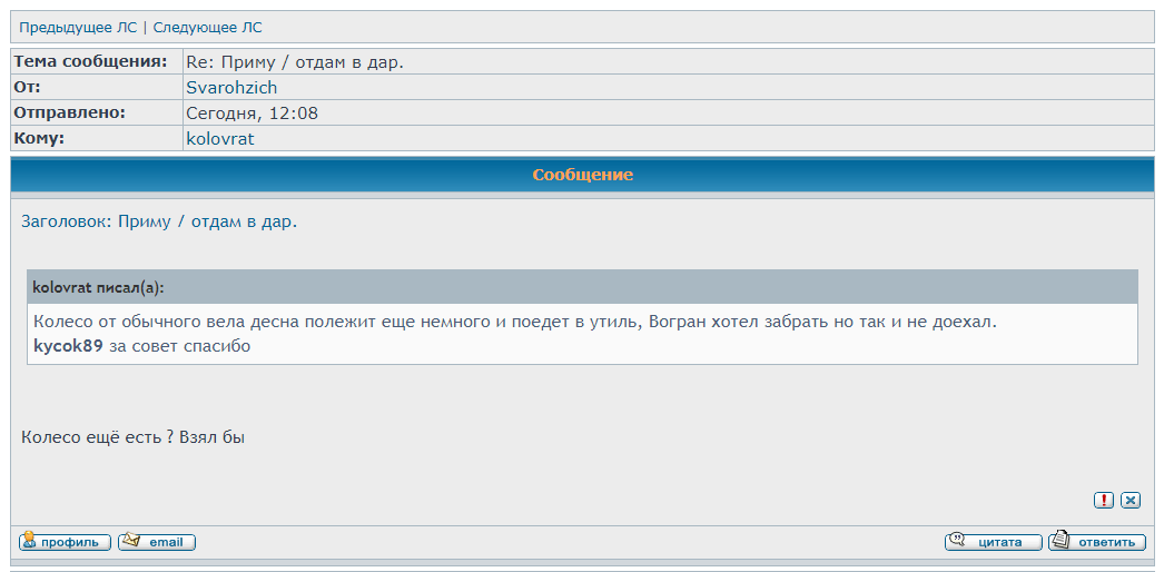 Кто вчера звонил и не представился? мне брать колесо на работу или нет? позвоните скажитеkolovrat писал(а):Колесо от обычного вела десна полежит еще немного и поедет в утиль, Вогран хотел забрать но так и не доехал.