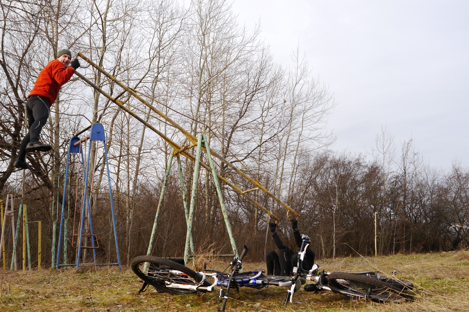 А тестирует модный нынче суровый стальной сурлиплюсобайк. Идея ехать против часовой стрелки была верной, встречены велосипедисты и группа косуль.