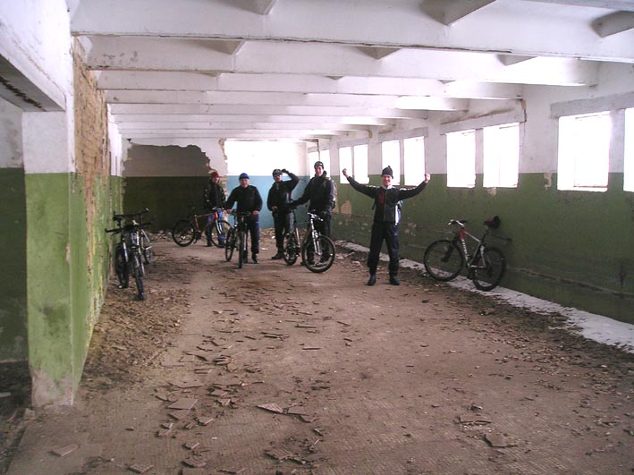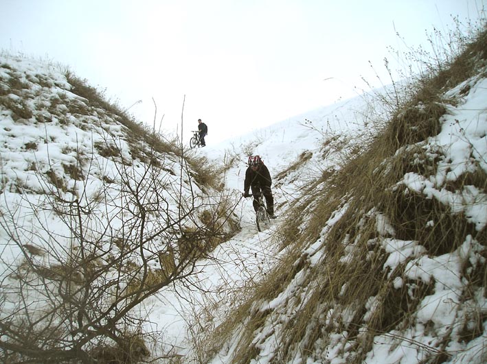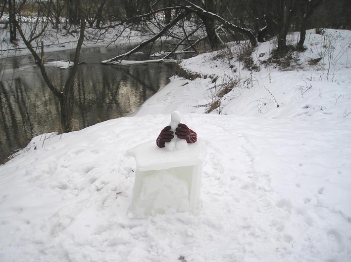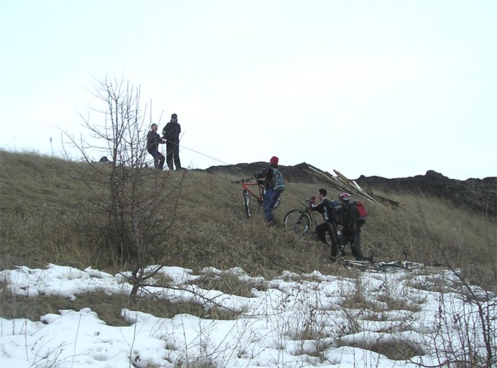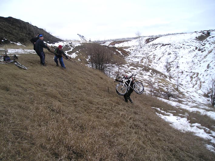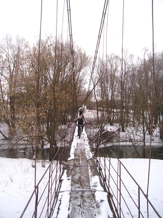 Сегодняшний маршрут получился совсем не на Погоново, о чем я ни разу не жалею. У цирка к моему приезду собрались 460, Inokoff, Radler, СергНик, Wowanbezbash, Zheny. Пока ждали Nedjmdinа на свежекупленой Лавине1, сообщество решило ехать смотреть подвесной мост через Девицу в Стрелице. Подъехал Саня, СергНик пожелал нам удачи и мы двинули на Песчаный Лог, не доезжая до которого, на улице Матросова Саня показал свой любимый фокус – порвал цепь. 460 был к этому готов и возил с собой запасную. Поставили – поехали уже таки в Песчаный Лог и дальше лесом в объезд аэродрома. Сегодня ехать было там можно. Снег был сырой и его спрессовал какой то доброхот на машине. По его следам, если не вилять, ехалось как по аствальду. Успешно миновав лес, обнаружили, что феерия чудес от Неджмдина продолжается – он сломал педаль и сказал, что поедет сам. Почему то жизнь занесла его на дамбу, а мы поехали совсем в другую сторону. Обогнув аэродромный бомбосклад, через лес выехали к церкви в Малышево, намереваясь попасть на шиловский понтон. Ехать туда по аствальду было бы банально. Поехали лугами мимо озер, любимым летним маршрутом, который гримаса зимы изменила до неузнаваемости. Пришлось попотеть. Мы с Иноковым катнули по льду озера. Лед очень толстый. От шиловского понтона полезли в гору, в жлобской гадюшник – деревню Устье. Обычно ездим от Устья к понтону, а сегодня наоборот. На околице Устья выстроили свиноферму, огражденную колючей проволокой.Чтобы преодолеть это препятствие пришлось поломать голову. Дыры в заборе с прошлого нашего визита туда заделали. Оказалось, что нужно проехать через заброшеный дом, то ли баню то ли еще что то. На фотографии видно. До Петино шла дорога, накатанная санными упряжками. Трясло неимоверно, но ехать было можно. От Петино в Орловку ведет астфальд, а дальше мы свернули в поля к карьерам и поехали по – серьезному, как в прошлые разы, с постоянными заносами и увязаниями. Последний кусок к карьерам пришлось пройти. Карьеры обкопали от таких как мы канавой глубиной метра в три. Пошли вдоль канавы и залезли в овраг. Он на фото. Южный склон у него оттаял и превратился в глиняное месиво. Тут и пригодилась веревка, которой затягивали отдыхающих в обнимку с велами. Радлер обнял аж два вела – свой и мой, и все равно был неминуемо затянут наверх. Наверху дорога, по которой ездят БЕЛАЗы, на пару сантиметров оттаяла и наматывалась на покрышки и цепь. Под треск цепи спустились к  р. Девице и поехали по ее правому берегу вверх искать подвесной мост. Долго ли коротко – мост нашли. Я его раньше не видел, но этот, кажется самый длинный. Метров двести будет. Висит себе над поймой. Под мостом устроили привал с салом (спасибо Жени!). В ознаменование уходящей зимы Иноков вылепил из снега символ плодородия. Так что будем с урожаем. Назад ехали через Девицу на Семилуки по аствальду с тягунами. В Семилуках посетили еще один подвесной мост, всем известный. Он покороче, но заснежен и с низким ограждением. Так и манит свалиться в Девицу с семиметровой высоты. Дон переехали по ж.д. мосту. В Подклетном разделились. Иноков и Радлер поехали на 9 января, а мы вдоль ж.д. в Юго Западный, Через ВОНЮЧКУ ГОЛУБОЙ ДУНАЙ и дальше до Перхоровича ехали по шпалам. Их присыпало снегом и ехалось нормально, Вот так прошла веломасленница. Правильно и разнообразно. До следующих встречь!