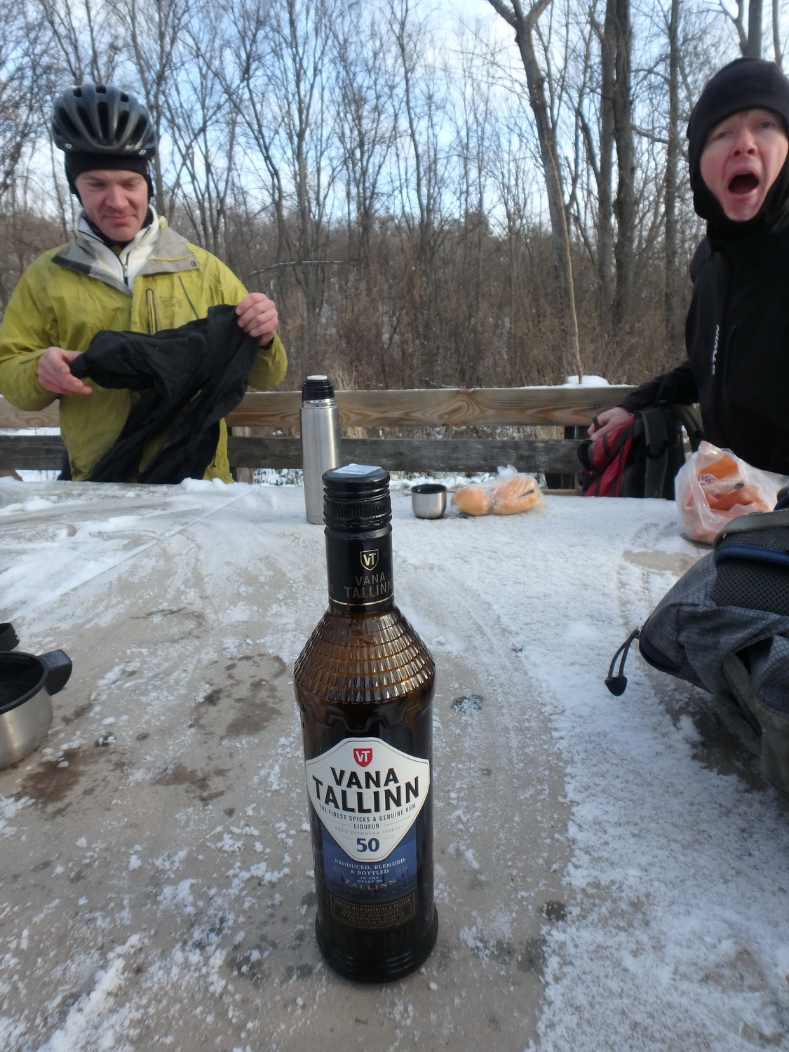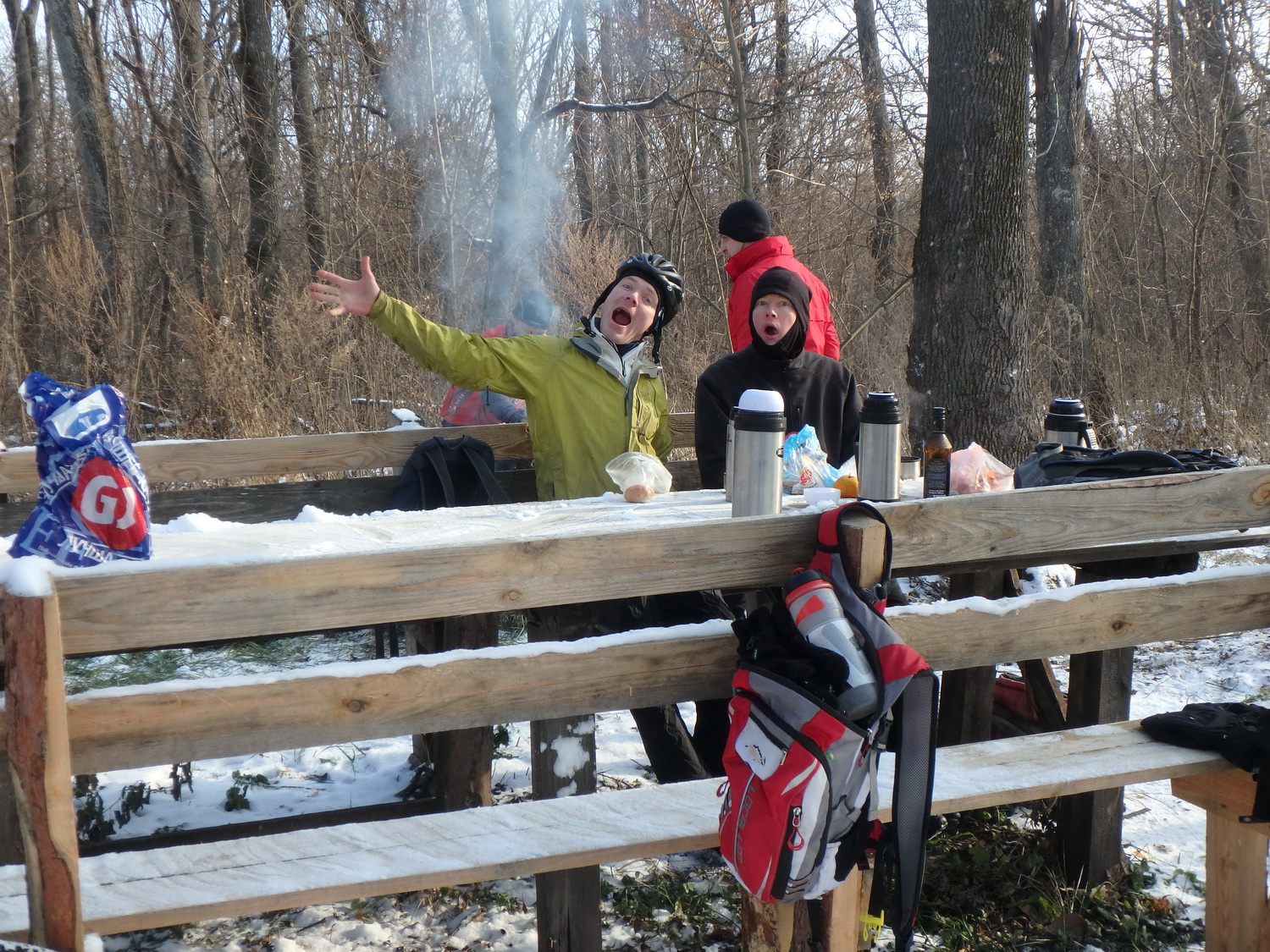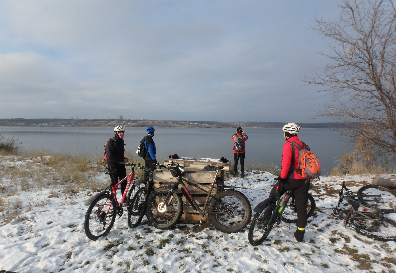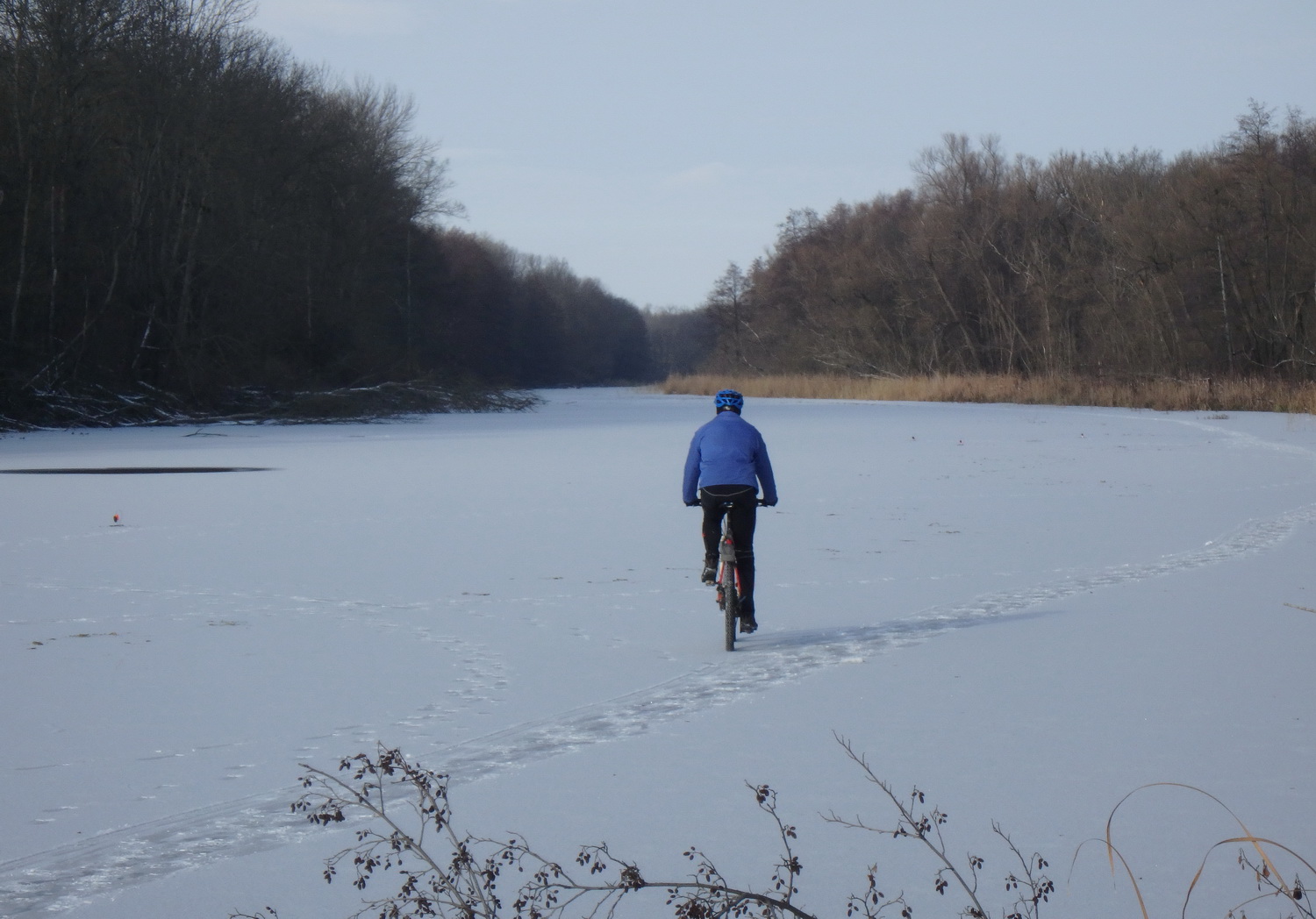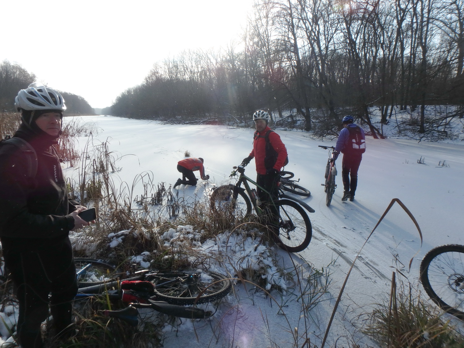 Ну а вверху уже куча лыжников, смотрящих на терпилу с недоумением. Но была и пара человек в теме, спрашивающие, совсем ли не едется. Там же вышел на одинокий квадрослед, по которому натоптали лыжню, однако и он оказался для меня пешеходным, рыхлый и рельефный, еще и вишенкой на торте лед под снегом. В общем, напешеходили я и мой велосипед сегодня знатно, 15 км за 3 часа. С непривычки сильно вымотало, ну и мороз + влажность + ветер = огонь.