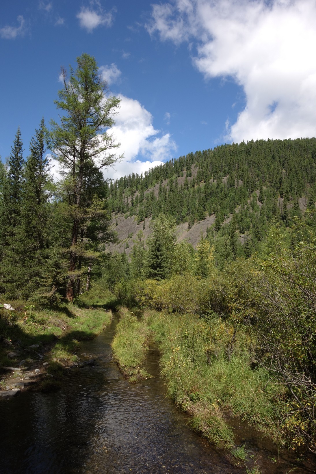 - На фото река Глубокая. Мы не смогли перейти её вброд. Место брода было не очень удачное - сильное течение сбивало с ног, не оставляло шансов. К счастью, брод был двойной "туда-обратно", поэтому потащились напролом вдоль берега