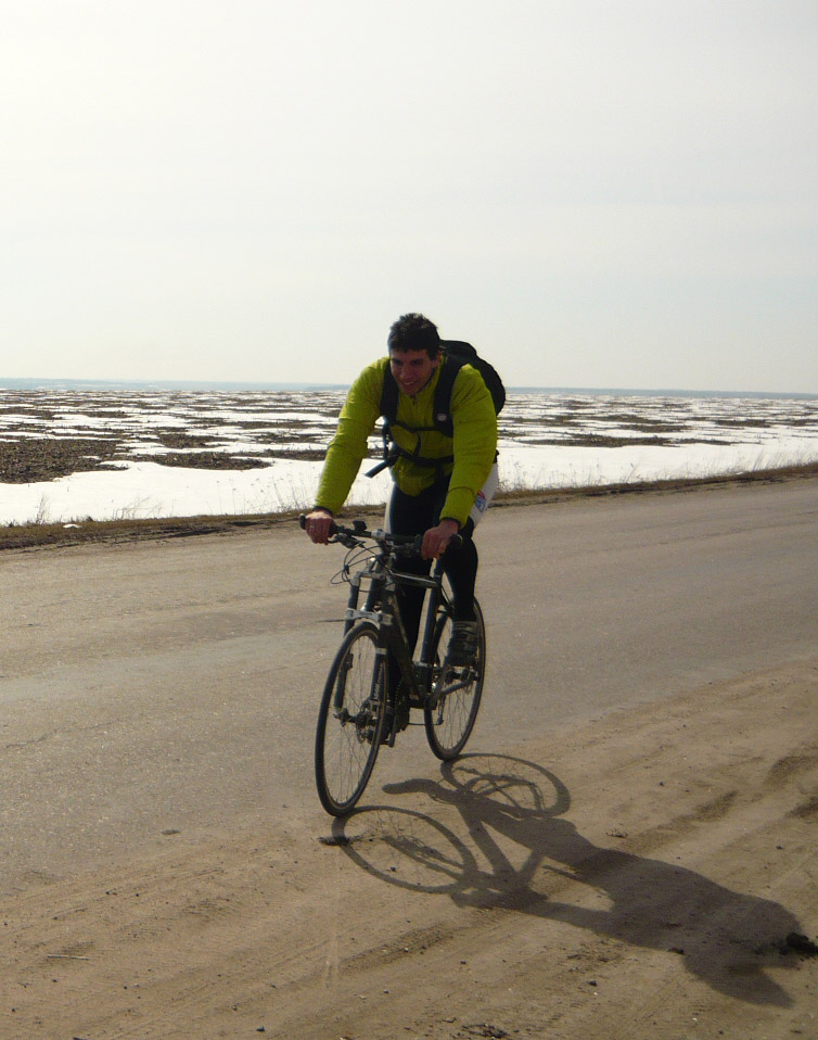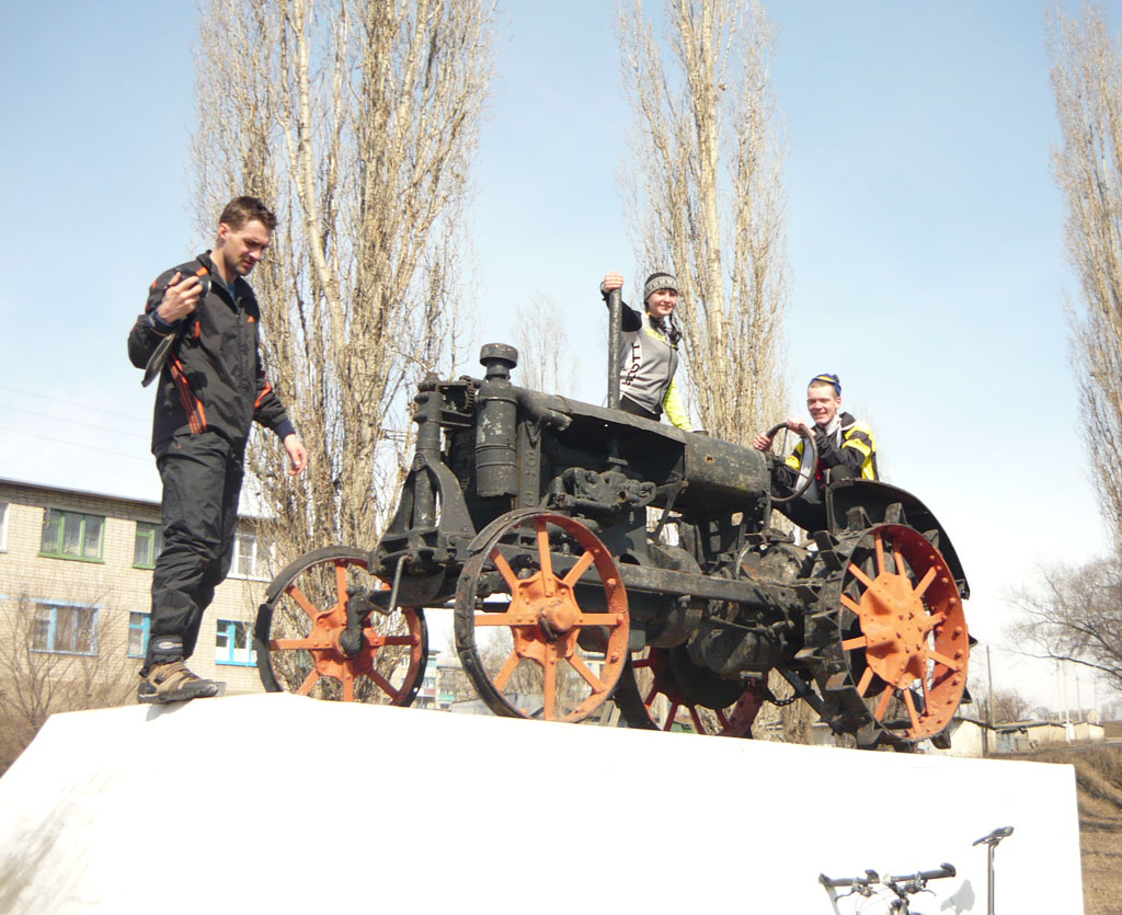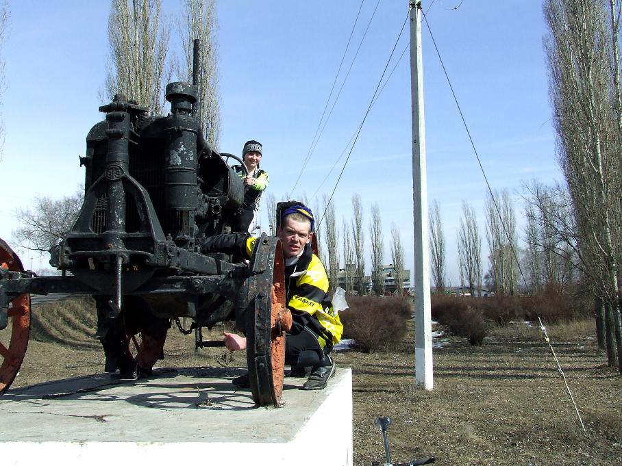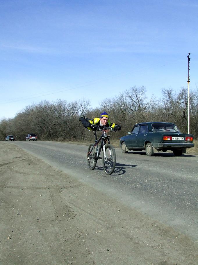 Ну что, ноги гудят – значит поездка удалась. Были припадочные штурмы тягунов, коих на маршруте подвернулось примерно четыре, были истошные гонки за лидером. Периодически останавливались и восстанавливались, так что средняя скорость получилась невысокая. Вот кто продрал глаза и явился ни свет ни заря на свидание: Rangifer, 460, Inokoff (на шоссере), konalex, Nedjmdin, Prog, Radler и я. Konalex и Prog поехали своим маршрутом, все остальные через Подклетное штурмовать Семилукский Тягун. По Подклетному ехали весело, раскинув руки в стороны, пока не увидели ментовский джип, велосипед на обочине и труп на травке. Непонятно, то ли его сбили, то ли помер просто так. +R.I.P+. После моста через Дон, разливом которого и не пахнет, началась работа по затаскиванию тяжестей в гору. Забравшись, повернули на Латное. На траверзе Семилук остановились попить водички, тут нас и обогнал СергНик. Обогнал и ушел в точку. Бросились его догонять. Догнали у ж.д. переезда после Семилук, но тут прокололся главный поставщик неожиданностей Nedjmdin. Пока штопался, Inokoff развлекал отдыхающих исполнением «ласточки» на велосипеде. Думаю, будут фото. Этот прием позволяет на спусках предельно уменьшить лобовое сопротивление. Поехали дальше. Догнали СергНика на повороте на Хохол с курской трассы. Добравшись до трактора в Хохле и устроив на нем фотосессию, все высматривали СергНика, но он нас как то обогнул. Больше его не встречали. Двинули к острогожской трассе, покорив два тягуна. После второго особенно хотелось гденьть лечь и потошнить Помимо всего остального, создалось впечатление, что на кольцевом маршруте все время был встречный ветер. Несильный, но встречный. По острогожской трассе проехали прочь от города до поворота на Гремячье. Мимо аэродрома проехать не сфотографировавшись не смогли. Пока фотографировались, кто то поймал в траве здоровенного клеща, проснувшегося и жаждавшего крови. Как истинные любители природы, клеща выпустили, мягко пожурив. Выпучив глаза спустились в Гремячье мимо памятника и церкви. Двинули на Шиловский понтон. После понтона 460 захотел в говны, еле отговорили. Созвонились с Мазаем, который ехал на своем новом веле с легкой рамой со стороны садов. Дождались Мазая, полюбовались его новым конем и через Малышево и Теннистый поехали к танку. В Тепличном 460 все таки полез в говны, свернув в Песчаный Лог. Сильно сомневаюсь, что сейчас этот лог хоть сколько – нибудь песчаный. Остальные поехали в Велолидер, где мне купили ЦЕПЬ! Потом разбрелись восвояси. Сказать по правде, аствальды поднадоели уже, хотя на всем 120 км. протяжении они были абсолютно сухими. До новых встреч!
